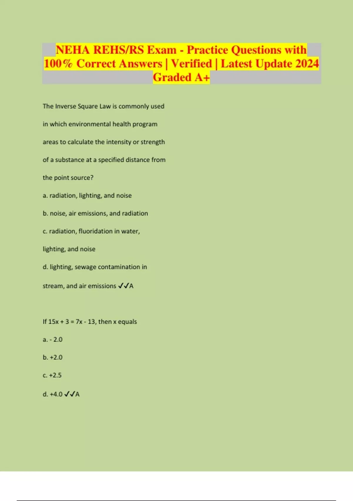 NEHA REHS/RS Exam - Practice Questions with 100% Correct Answers | Verified | Latest Update 2024 Graded A+