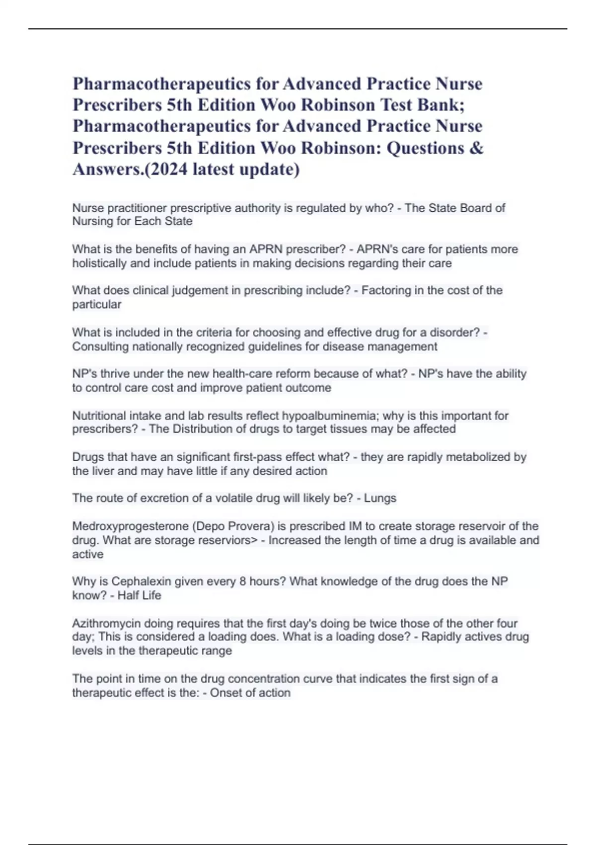 Pharmacotherapeutics for Advanced Practice Nurse Prescribers 5th Edition Woo Robinson Test Bank; Pharmacotherapeutics for Advanced Practice Nurse Prescribers 5th Edition Woo Robinson: Questions & Answers.(2024 latest update)