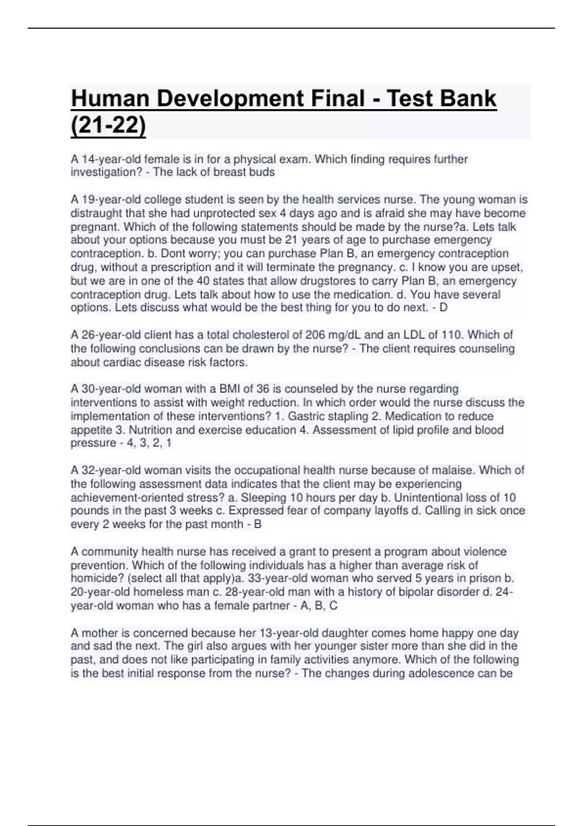 A 14-year-old female is in for a physical exam. Which finding requires further investigation? - The lack of breast buds A 19-year-old college student is seen by the health services nurse. The young woman is distraught that she had unprotected sex 4 days ago and is afraid she may have become pregnant. Which of the following statements should be made by the nurse?a. Lets talk about your options because you must be 21 years of age to purchase emergency contraception. b. Dont worry; you can purchase Plan B, an emergency contraception drug, without a prescription and it will terminate the pregnancy. c. I know you are upset, but we are in one of the 40 states that allow drugstores to carry Plan B, an emergency contraception drug. Lets talk about how to use the medication. d. You have several options. Lets discuss what would be the best thing for you to do next. - D A 26-year-old client has a total cholesterol of 206 mg/dL and an LDL of 110. Which of the following conclusions can be drawn by the nurse? - The client requires counseling about cardiac disease risk factors. A 30-year-old woman with a BMI of 36 is counseled by the nurse regarding interventions to assist with weight reduction. In which order would the nurse discuss the implementation of these interventions? 1. Gastric stapling 2. Medication to reduce appetite 3. Nutrition and exercise education 4. Assessment of lipid profile and blood pressure - 4, 3, 2, 1 A 32-year-old woman visits the occupational health nurse because of malaise. Which of the following assessment data indicates that the client may be experiencing achievement-oriented stress? a. Sleeping 10 hours per day b. Unintentional loss of 10 pounds in the past 3 weeks c. Expressed fear of company layoffs d. Calling in sick once every 2 weeks for the past month -