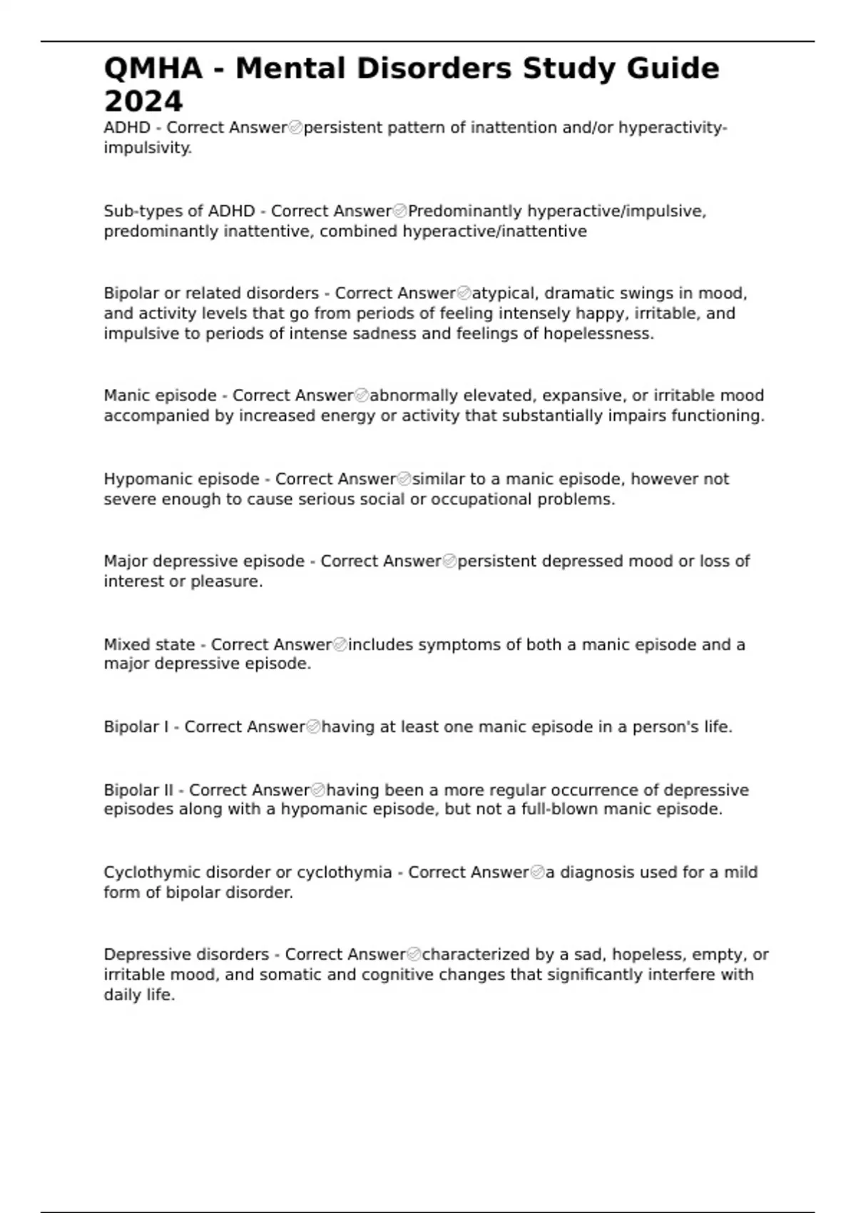 QMHA - Mental Disorders Study Guide 2024