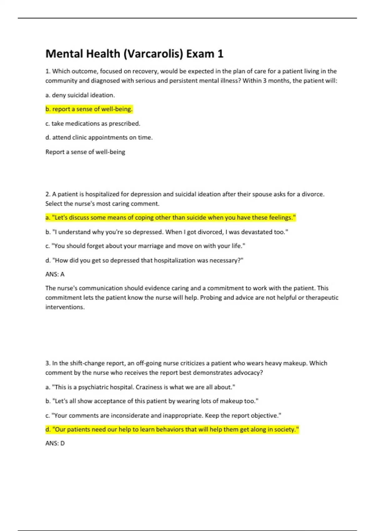 1. Which outcome, focused on recovery, would be expected in the plan of care for a patient living in the community and diagnosed with serious and persistent mental illness? Within 3 months, the patient will: a. deny suicidal ideation. b. report a sense of well-being. c. take medications as prescribed. d. attend clinic appointments on time. Report a sense of well-being 2. A patient is hospitalized for depression and suicidal ideation after their spouse asks for a divorce. Select the nurse's most caring comment. a. "Let's discuss some means of coping other than suicide when you have these feelings." b. "I understand why you're so depressed. When I got divorced, I was devastated too." c. "You should forget about your marriage and move on with your life." d. "How did you get so depressed that hospitalization was necessary?" ANS: A The nurse's communication should evidence caring and a commitment to work with the patient. This commitment lets the patient know the nurse will help. Probing and advice are not helpful or therapeutic interventions.