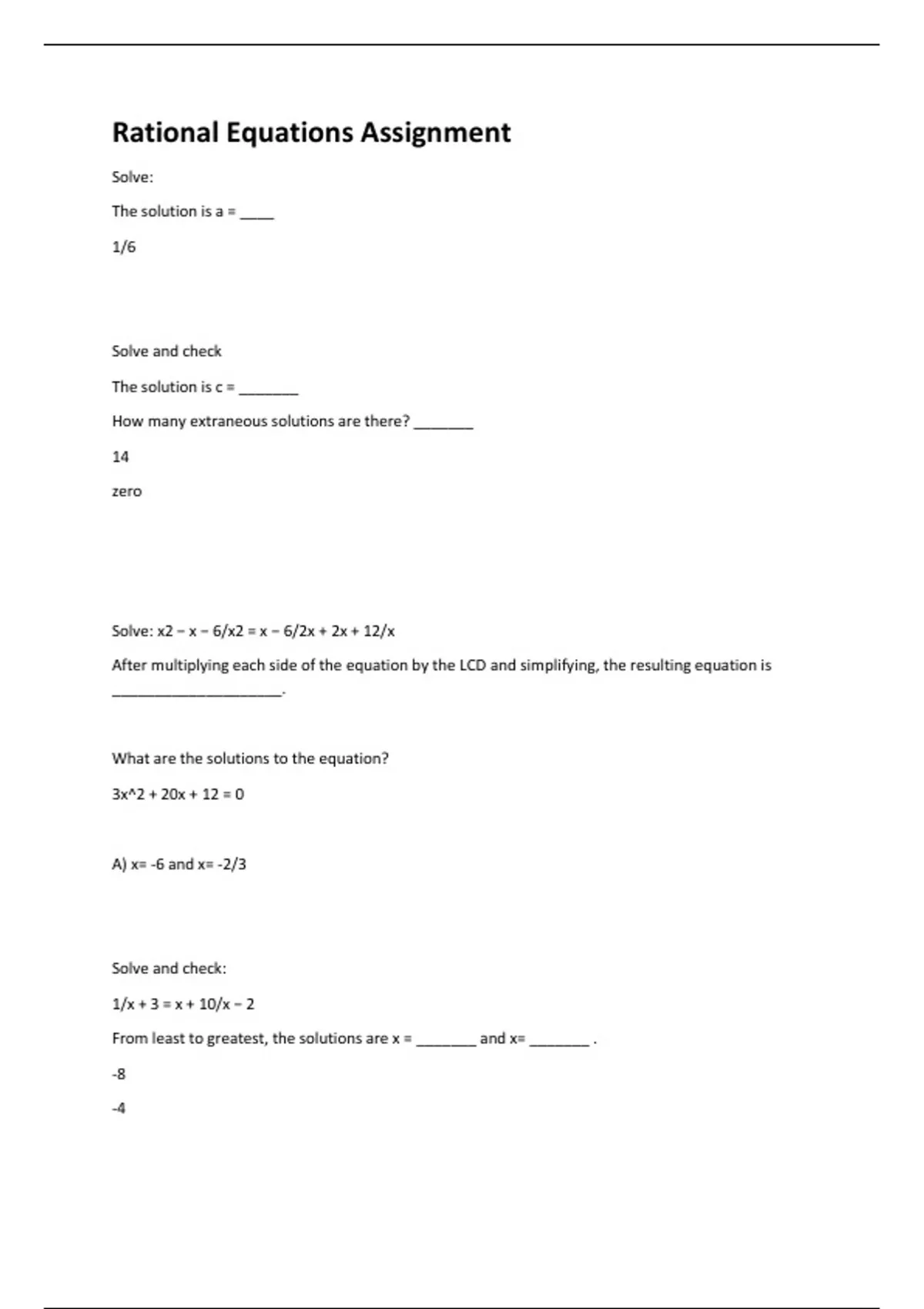 Solve: The solution is a = ____ 1/6 Solve and check The solution is c = _______ How many extraneous solutions are there? _______ 14 zero Solve: x2 − x − 6/x2 = x − 6/2x + 2x + 12/x After multiplying each side of the equation by the LCD and simplifying, the resulting equation is ____________________.