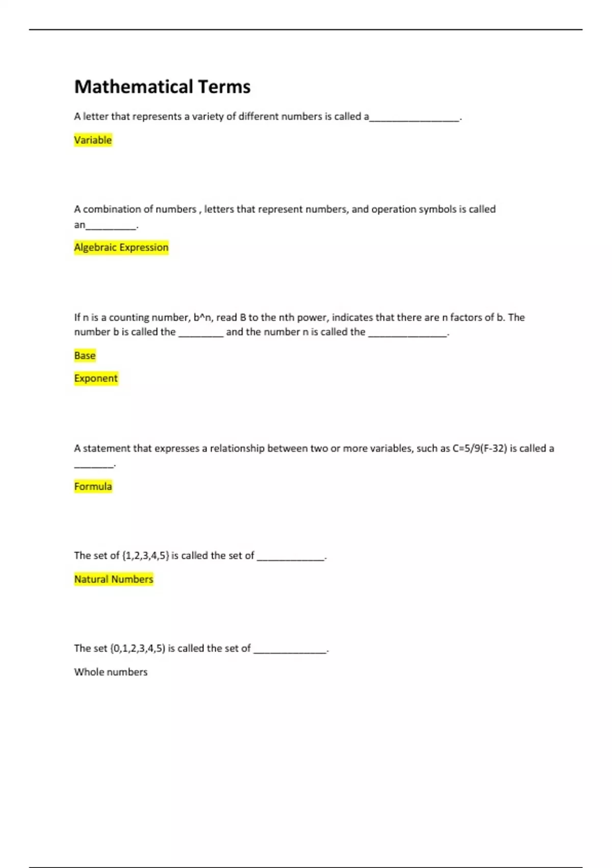 A letter that represents a variety of different numbers is called a________________. Variable A combination of numbers , letters that represent numbers, and operation symbols is called an_________. Algebraic Expression If n is a counting number, b^n, read B to the nth power, indicates that there are n factors of b. The number b is called the ________ and the number n is called the ______________. Base Exponent A statement that expresses a relationship between two or more variables, such as C=5/9(F-32) is called a _______. Formula The set of {1,2,3,4,5} is called the set of ____________. Natural Numbers