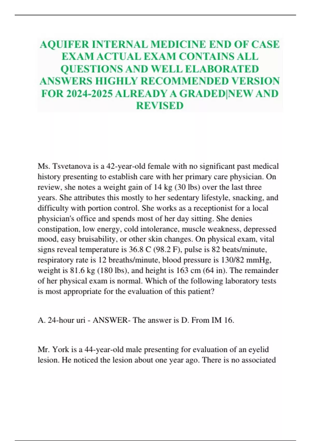 AQUIFER INTERNAL MEDICINE END OF CASE EXAM ACTUAL EXAM CONTAINS ALL QUESTIONS AND WELL ELABORATED ANSWERS HIGHLY RECOMMENDED VERSION FOR ALREADY A GRADED|NEW AND REVISED