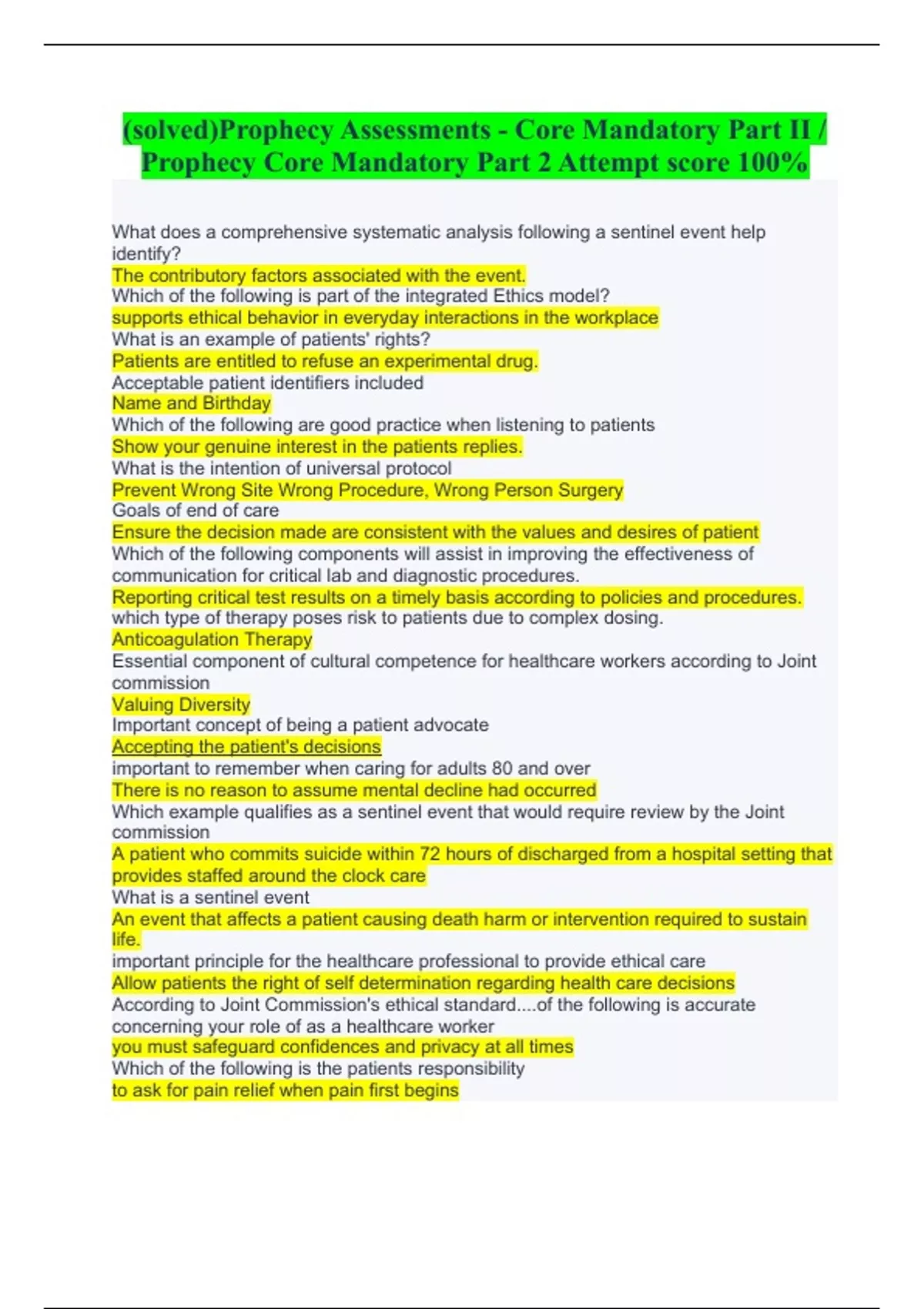 solved)Prophecy Assessments - Core Mandatory Part II / Prophecy Core Mandatory Part 2 Attempt score 100% What does a comprehensive systematic analysis following a sentinel event help identify? The contributory factors associated with the event. Which of the following is part of the integrated Ethics model? supports ethical behavior in everyday interactions in the workplace What is an example of patients' rights? Patients are entitled to refuse an experimental drug. Acceptable patient identifiers included Name and Birthday Which of the following are good practice when listening to patients Show your genuine interest in the patients replies. What is the intention of universal protocol Prevent Wrong Site Wrong Procedure, Wrong Person Surgery Goals of end of care Ensure the decision made are consistent with the values and desires of patient Which of the following components will assist in improving the effectiveness of communication for critical lab and diagnostic procedures. Reporting critical test results on a timely basis according to policies and procedures. which type of therapy poses risk to patients due to complex dosing. Anticoagulation Therapy Essential component of cultural competence for healthcare workers according to Joint commission Valuing Diversity Important concept of being a patient advocate Accepting the patient's decisions important to remember when caring for adults 80 and over There is no reason to assume mental decline had occurred Which example qualifies as a sentinel event that would require review by the Joint commission A patient who commits suicide within 72 hours of discharged from a hospital setting that provides staffed around the clock care What is a sentinel event An event that affects a patient causing death harm or intervention required to sustain life. important principle for the healthcare professional to provide ethical care Allow patients the right of self determination regarding health care decisions According to Joint Commission's ethical standard....of the following is accurate concerning your role of as a healthcare worker you must safeguard confidences and privacy at all times Which of the following is the patients responsibility to ask for pain relief when pain first begins