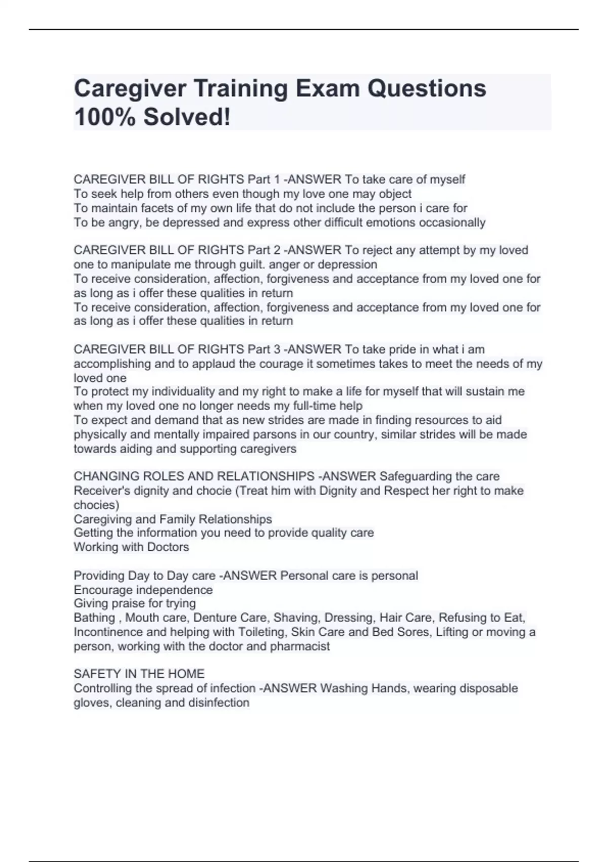 CAREGIVER BILL OF RIGHTS Part 1 -ANSWER To take care of myself To seek help from others even though my love one may object To maintain facets of my own life that do not include the person i care for To be angry, be depressed and express other difficult emotions occasionally CAREGIVER BILL OF RIGHTS Part 2 -ANSWER To reject any attempt by my loved one to manipulate me through guilt. anger or depression To receive consideration, affection, forgiveness and acceptance from my loved one for as long as i offer these qualities in return To receive consideration, affection, forgiveness and acceptance from my loved one for as long as i offer these qualities in return CAREGIVER BILL OF RIGHTS Part 3 -ANSWER To take pride in what i am accomplishing and to applaud the courage it sometimes takes to meet the needs of my loved one To protect my individuality and my right to make a life for myself that will sustain me when my loved one no longer needs my full-time help To expect and demand that as new strides are made in finding resources to aid physically and mentally impaired parsons in our country, similar strides will be made towards aiding and supporting caregivers CHANGING ROLES AND RELATIONSHIPS -ANSWER Safeguarding the care Receiver's dignity and chocie (Treat him with Dignity and Respect her right to make chocies) Caregiving and Family Relationships Getting the information you need to provide quality care Working with Doctors
