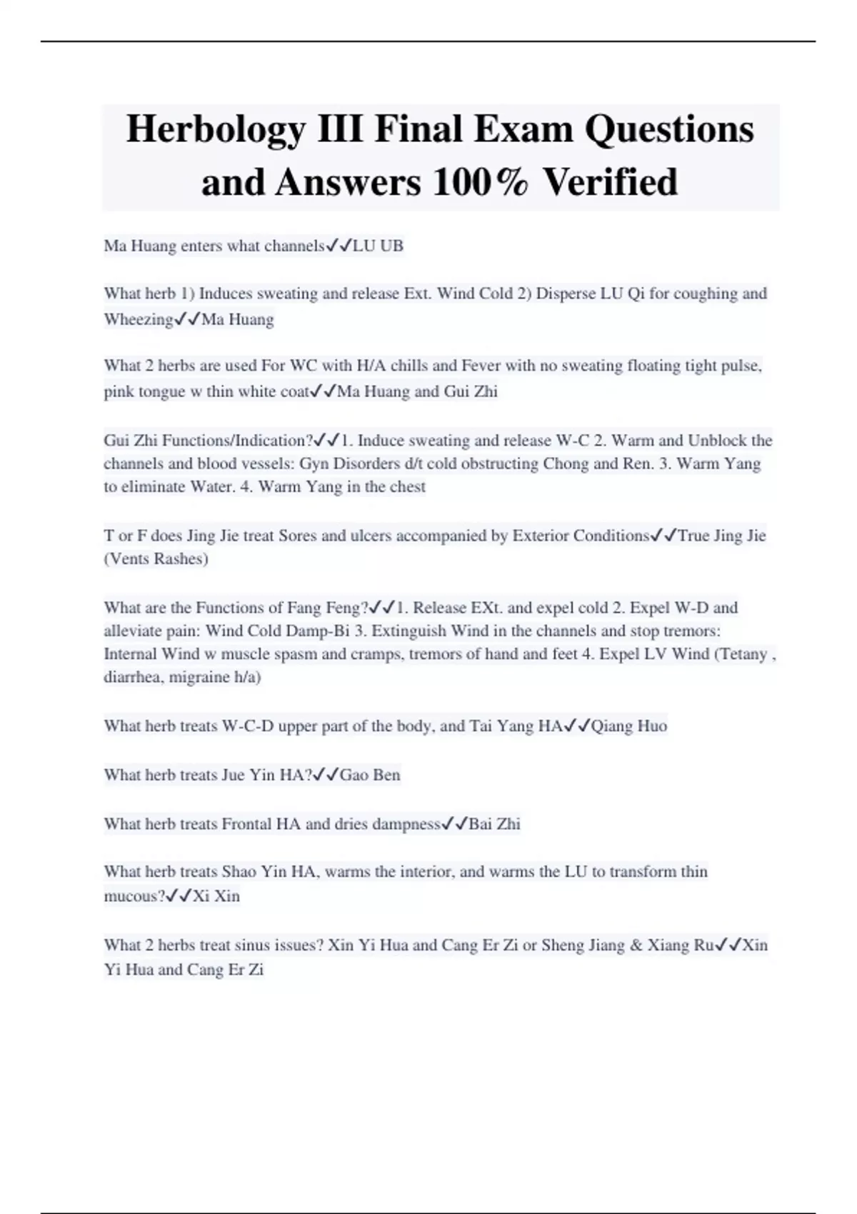 Herbology III Final Exam Questions and Answers 100% Verified Ma Huang enters what channelsLU UB What herb 1) Induces sweating and release Ext. Wind Cold 2) Disperse LU Qi for coughing and WheezingMa Huang What 2 herbs are used For WC with H/A chills and Fever with no sweating floating tight pulse, pink tongue w thin white coatMa Huang and Gui Zhi Gui Zhi Functions/Indication?1. Induce sweating and release W-C 2. Warm and Unblock the channels and blood vessels: Gyn Disorders d/t cold obstructing Chong and Ren. 3. Warm Yang to eliminate Water. 4. Warm Yang in the chest T or F does Jing Jie treat Sores and ulcers accompanied by Exterior ConditionsTrue Jing Jie (Vents Rashes) What are the Functions of Fang Feng?1. Release EXt. and expel cold 2. Expel W-D and alleviate pain: Wind Cold Damp-Bi 3. Extinguish Wind in the channels and stop tremors: Internal Wind w muscle spasm and cramps, tremors of hand and feet 4. Expel LV Wind (Tetany , diarrhea, migraine h/a) What herb treats W-C-D upper part of the body, and Tai Yang HAQiang Huo What herb treats Jue Yin HA?Gao Ben What herb treats Frontal HA and dries dampnessBai Zhi What herb treats Shao Yin HA, warms the interior, and warms the LU to transform thin mucous?Xi Xin What 2 herbs treat sinus issues? Xin Yi Hua and Cang Er Zi or Sheng Jiang & Xiang RuXin Yi Hua and Cang Er Zi