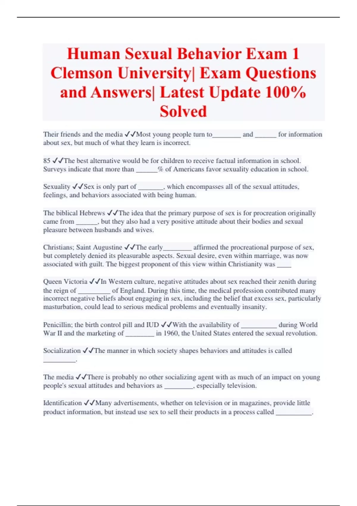 Human Sexual Behavior Exam 1 Clemson University| Exam Questions and Answers| Latest Update 100% Solved Their friends and the media Most young people turn to________ and ______ for information about sex, but much of what they learn is incorrect. 85 The best alternative would be for children to receive factual information in school. Surveys indicate that more than ______% of Americans favor sexuality education in school. Sexuality Sex is only part of _______, which encompasses all of the sexual attitudes, feelings, and behaviors associated with being human. The biblical Hebrews The idea that the primary purpose of sex is for procreation originally came from ______, but they also had a very positive attitude about their bodies and sexual pleasure between husbands and wives. Christians; Saint Augustine The early________ affirmed the procreational purpose of sex, but completely denied its pleasurable aspects. Sexual desire, even within marriage, was now associated with guilt. The biggest proponent of this view within Christianity was ____ Queen Victoria In Western culture, negative attitudes about sex reached their zenith during