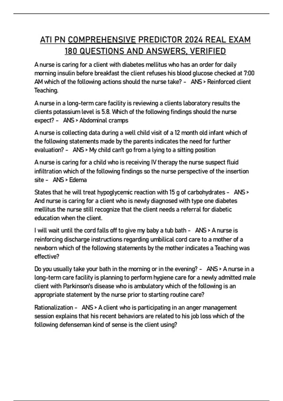 ATI PN COMPREHENSIVE PREDICTOR 2024 REAL EXAM 180 QUESTIONS AND ANSWERS, VERIFIED