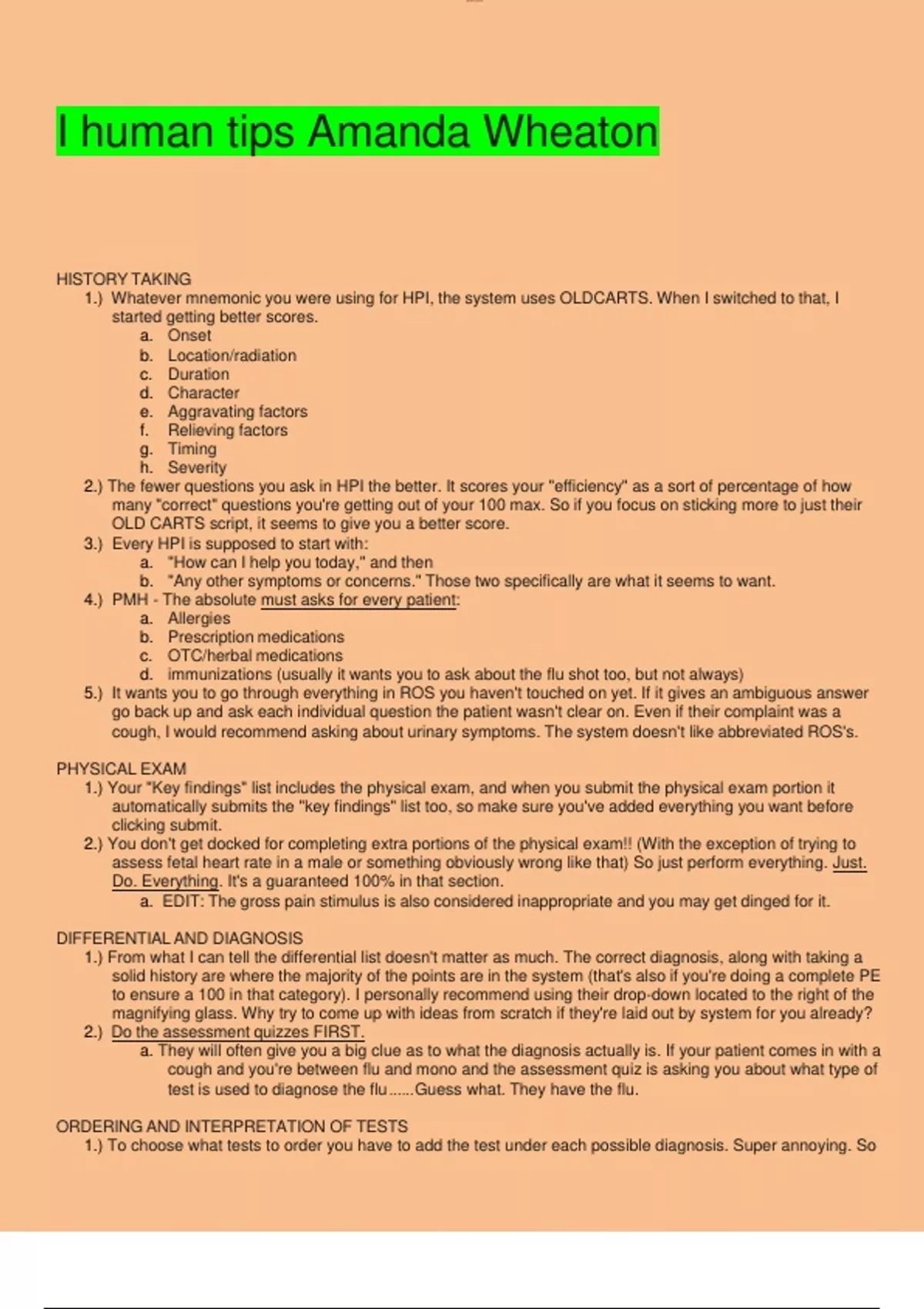 HISTORY TAKING 1.) Whatever mnemonic you were using for HPI, the system uses OLDCARTS. When I switched to that, I started getting better scores. a. Onset b. Location/radiation c. Duration d. Character e. Aggravating factors f. Relieving factors g. Timing h. Severity 2.) The fewer questions you ask in HPI the better. It scores your "efficiency" as a sort of percentage of how many "correct" questions you're getting out of your 100 max. So if you focus on sticking more to just their OLD CARTS script, it seems to give you a better score. 3.) Every HPI is supposed to start with: a. "How can I help you today," and then b. "Any other symptoms or concerns." Those two specifically are what it seems to want. 4.) PMH - The absolute must asks for every patient: a. Allergies b. Prescription medications c. OTC/herbal medications d. immunizations (usually it wants you to ask about the flu shot too, but not always) 5.) It wants you to go through everything in ROS you haven't touched on yet. If it gives an ambiguous answer go back up and ask each individual question the patient wasn't clear on. Even if their complaint was a cough, I would recommend asking about urinary symptoms. The system doesn't like abbreviated ROS's. PHYSICAL EXAM 1.) Your "Key findings" list includes the physical exam, and when you submit the physical exam portion it automatically submits the "key findings" list too, so make sure you've added everything you want before clicking submit. 2.) You don't get docked for completing extra portions of the physical exam!! (With the exception of trying to assess fetal heart rate in a male or something obviously wrong like that) So just perform everything. Just. Do. Everything. It's a guaranteed 100% in that section. a. EDIT: The gross pain stimulus is also considered inappropriate and you may get dinged for it. DIFFERENTIAL AND DIAGNOSIS 1.) From what I can tell the differential list doesn't matter as much. The correct diagnosis, along with taking a solid history are where the majority of the points are in the system (that's also if you're doing a complete PE to ensure a 100 in that category). I personally recommend using their drop-down located to the right of the magnifying glass. Why try to come up with ideas from scratch if they're laid out by system for you already? 2.) Do the assessment quizzes FIRST. a. They will often give you a big clue as to what the diagnosis actually is. If your patient comes in with a cough and you're between flu and mono and the assessment quiz is asking you about what type of test is used to diagnose the flu......Guess what. They have the flu. ORDERING AND INTERPRETATION OF TESTS 1.) To choose what tests to order you have to add the test under each possible diagnosis. Super annoying. SolOMoAR cPSD| you can't just order one CXR, you're going to have to select it three times each under pneumonia, rib fracture, and pleural effusion for example. 2.) I again recommend using their drop-down here instead of trying to search for tests by typing it in the search bar. 3.) LFTs are their own separate order, even if you already ordered a CMP. The system won't give you credit for it unless you order them separately. 4.) The system will interpret the tests for you. Don't get stuck wondering how on earth you're supposed to be able to interupt ECHO imaging like I did. Ab