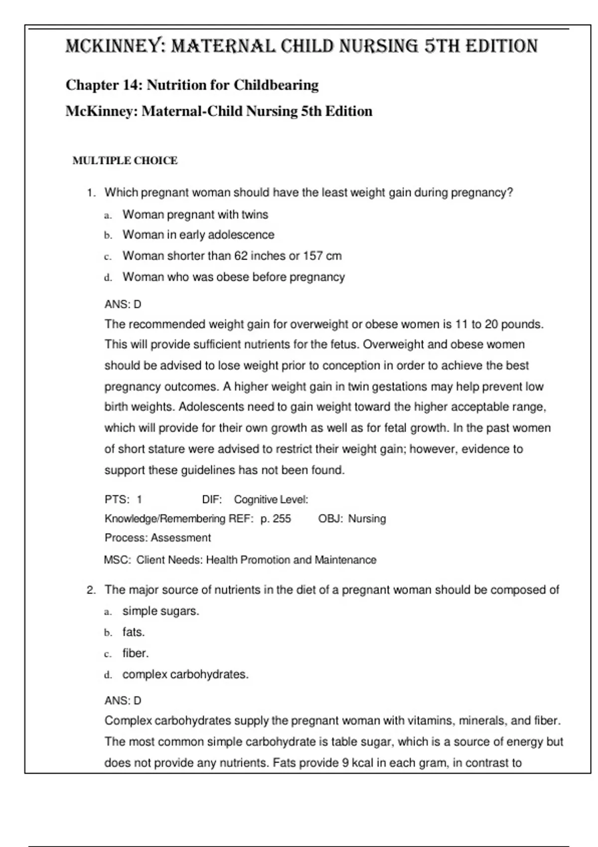 Maternal Child Nursing 5th Edition by McKinney- ISBN- 978-0323401708 TEST BANK Chapter 14: Nutrition for Childbearing Verified 2024 Practice Questions and 100% Correct Answers with Explanations for Exam Preparation, Graded A+ Which pregnant woman should have the least weight gain during pregnancy? a. Woman pregnant with twins b. Woman in early adolescence c. Woman shorter than 62 inches or 157 cm d. Woman who was obese before pregnancy ANS: D The recommended weight gain for overweight or obese women is 11 to 20 pounds. This will provide sufficient nutrients for the fetus. Overweight and obese women should be advised to lose weight prior to conception in order to achieve the best pregnancy outcomes. A higher weight gain in twin gestations may help prevent low birth weights. Adolescents need to gain weight toward the higher acceptable range, which will provide for their own growth as well as for fetal growth. In the past women of short stature were advised to restrict their weight gain; however, evidence to support these guidelines has not been found. PTS: 1 DIF: Cognitive Level: Knowledge/Remembering REF: p. 255 OBJ: Nursing Process: Assessment MSC: Client Needs: Health Promotion and Maintenance 2. The major source of nutrients in the diet of a pregnant woman should be composed of a. simple sugars. b. fats. c. fiber. d. complex carbohydrates. ANS: D Complex carbohydrates supply the pregnant woman with vitamins, minerals, and fiber. The most common simple carbohydrate is table sugar, which is a source of energy but does not provide any nutrients. Fats provide 9 kcal in each gram, in contrast to carbohydrates and proteins, which provide only 4 kcal in each gram. However, fat is not a good source of nutrients. Fiber is supplied mainly by the complex carbohydrates. PTS: 1 DIF: Cognitive Level: Knowledge/Remembering REF: p. 257 OBJ: Nursing Process: Assessment MSC: Client Needs: Physiologic Integrity