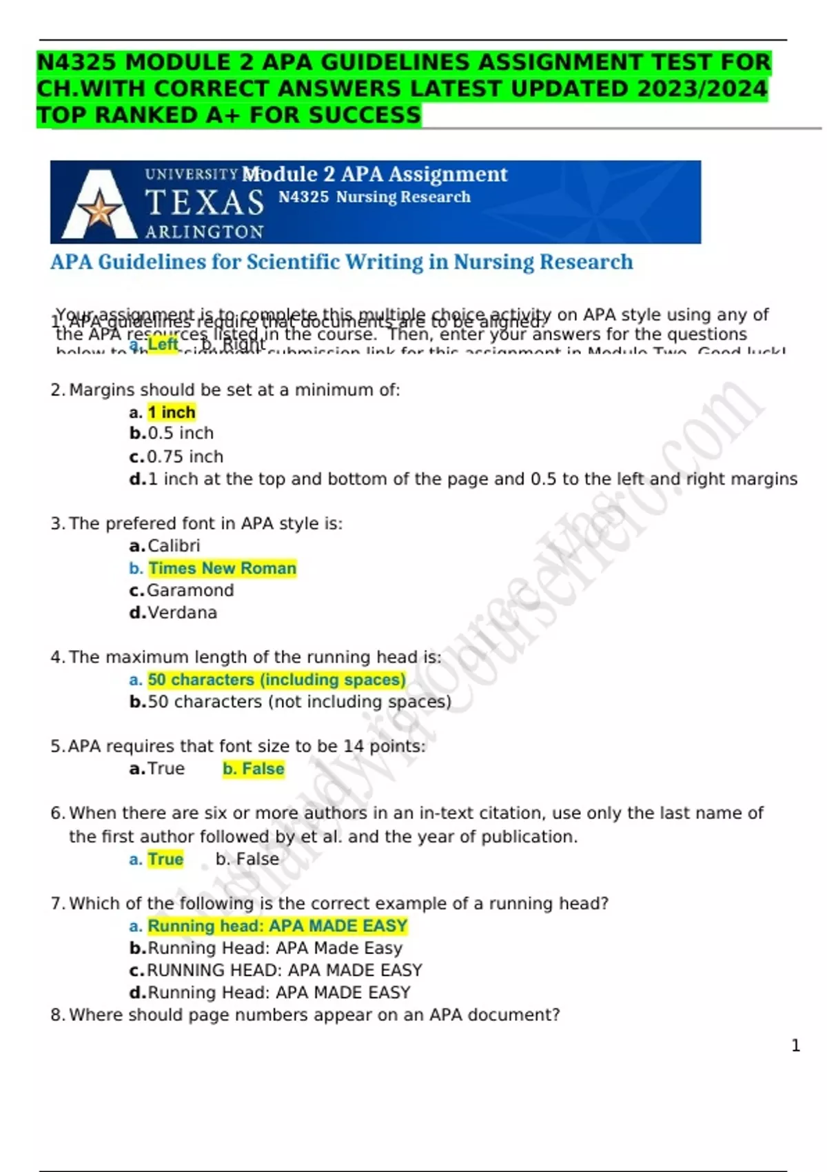 N4325 MODULE 2 APA GUIDELINES ASSIGNMENT TEST FOR CH.WITH CORRECT ANSWERS LATEST UPDATED 2023/2024 TOP RANKED A+ FOR SUCCESS