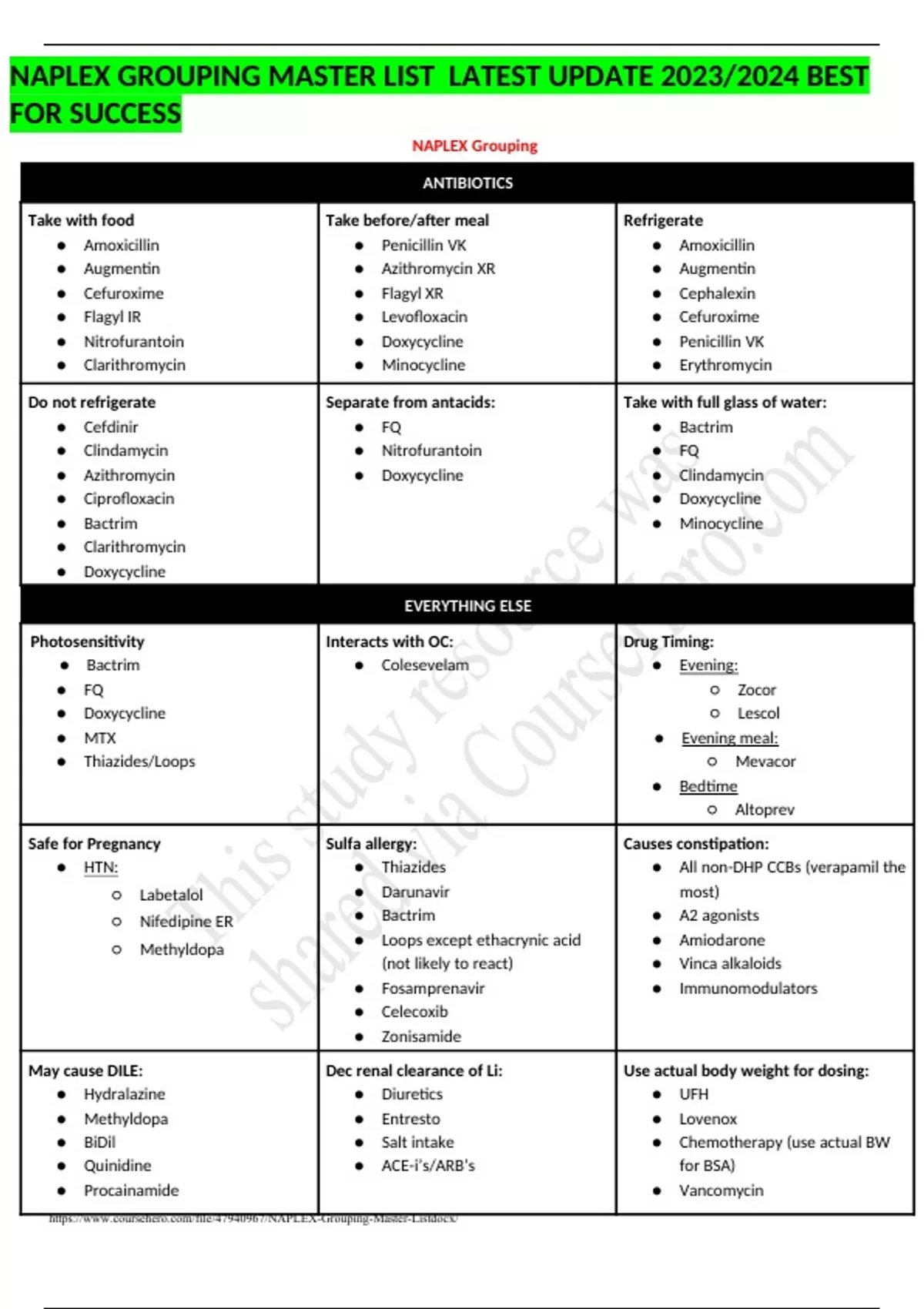 NAPLEX GROUPING MASTER LIST LATEST UPDATE 2023/2024 BEST FOR SUCCESS