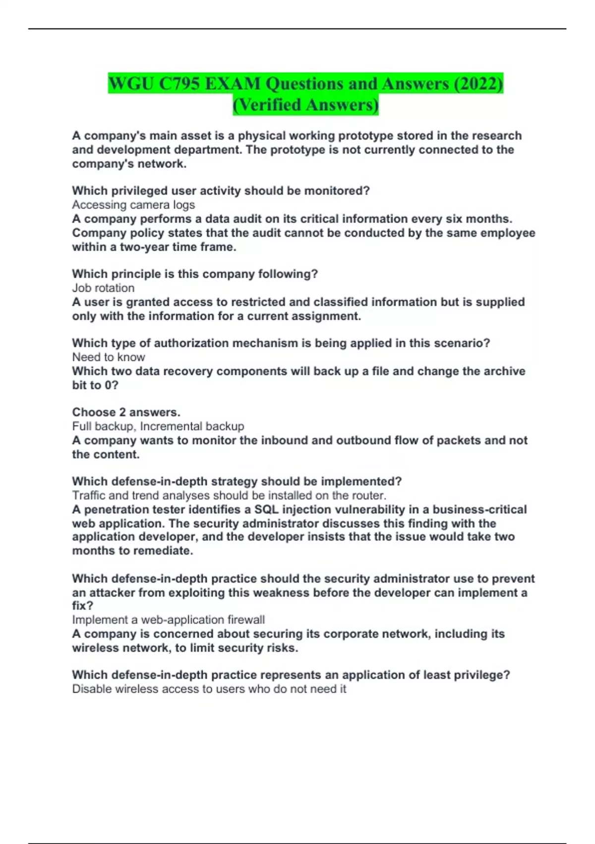 WGU C795 EXAM Questions and Answers (2022) (Verified Answers) A company's main asset is a physical working prototype stored in the research and development department. The prototype is not currently connected to the company's network. Which privileged user activity should be monitored? Accessing camera logs A company performs a data audit on its critical information every six months. Company policy states that the audit cannot be conducted by the same employee within a two-year time frame. Which principle is this company following? Job rotation A user is granted access to restricted and classified information but is supplied only with the information for a current assignment. Which type of authorization mechanism is being applied in this scenario? Need to know Which two data recovery components will back up a file and change the archive bit to 0? Choose 2 answers. Full backup, Incremental backup A company wants to monitor the inbound and outbound flow of packets and not the content. Which defense-in-depth strategy should be implemented? Traffic and trend analyses should be installed on the router. A penetration tester identifies a SQL injection vulnerability in a business-critical web application. The security administrator discusses this finding with the application developer, and the developer insists that the issue would take two months to remediate. Which defense-in-depth practice should the security administrator use to prevent an attacker from exploiting this weakness before the developer can implement a fix? Implement a web-application firewall A company is concerned about securing its corporate network, including its wireless network, to limit security risks. Which defense-in-depth practice represents an application of least privilege? Disable wireless access to users who do not need it A technician notifies her supervisor that the nightly backup of a critical system failed during the previous night's run. Because the system is critical to the organization, the technician raised the issue in order to make management aware of the missing backup. The technician is looking for guidance on whether additional actions should be taken on the single backup failure. Which role is responsible for making the final decision on how to handle the incomplete backup? Data owner A company relies exclusively on a system for critical functions. An audit is performed, and the report notes that there is no log review performed on the system. Management has been tasked with selecting the appropriate person to perform the log reviews in order to correct the deficiency. Which role is responsible for reviewing and auditing logs in order to detect any malicious behavior? Security Administrator A company's main asset is its client list stored in the company database, which is accessible to only specific users. The client list contains Health Insurance Portability and Accountability Act (HIPAA) protected data. Which user activity should be monitored? Privilege escalation An employee is transferring data onto removable media. The company wants to reduce the likelihood of fraud, and transferring data onto removable media is limited to special cases. Which security principle should the company execute as a policy to reduce fraud? Two person control An executive is using a cell phone to view sensitive data. Which control would protect the sensitive data stored on the phone from being exposed due to loss or theft? Encryption A company has identified a massive security breach in its healthcare records department. Over 50% of customers' personally identifiable information (PII) has been stolen. The customers are aware of the breach, and the company is taking actions to protect customer assets through the personal security policy, which addresses PII data. Which preventive measure should the company pursue to protect against future attacks? Use network-based and host-based firewalls An organization needs to improve the security of the systems it is monitoring. It has determined that the systems need regularly scheduled vulnerability scans.