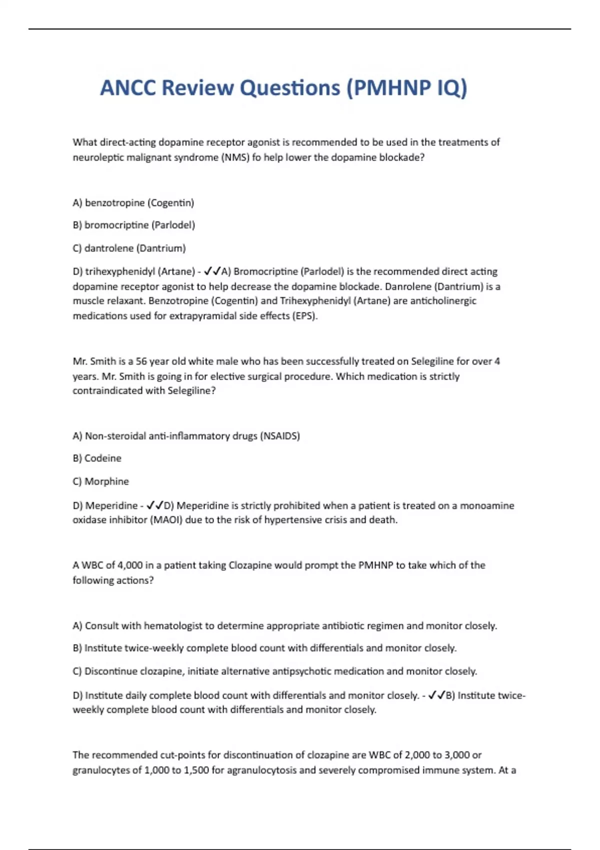 What direct-acting dopamine receptor agonist is recommended to be used in the treatments of neuroleptic malignant syndrome (NMS) fo help lower the dopamine blockade? A) benzotropine (Cogentin) B) bromocriptine (Parlodel) C) dantrolene (Dantrium) D) trihexyphenidyl (Artane) - A) Bromocriptine (Parlodel) is the recommended direct acting dopamine receptor agonist to help decrease the dopamine blockade. Danrolene (Dantrium) is a muscle relaxant. Benzotropine (Cogentin) and Trihexyphenidyl (Artane) are anticholinergic medications used for extrapyramidal side effects (EPS). Mr. Smith is a 56 year old white male who has been successfully treated on Selegiline for over 4 years. Mr. Smith is going in for elective surgical procedure. Which medication is strictly contraindicated with Selegiline? A) Non-steroidal anti-inflammatory drugs (NSAIDS) B) Codeine C) Morphine D) Meperidine - D) Meperidine is strictly prohibited when a patient is treated on a monoamine oxidase inhibitor (MAOI) due to the risk of hypertensive crisis and death. A WBC of 4,000 in a patient taking Clozapine would prompt the PMHNP to take which of the following actions? A) Consult with hematologist to determine appropriate antibiotic regimen and monitor closely. B) Institute twice-weekly complete blood count with differentials and monitor closely. C) Discontinue clozapine, initiate alternative antipsychotic medication and monitor closely. D) Institute daily complete blood count with differentials and monitor closely. - B) Institute twice- weekly complete blood count with differentials and monitor closely. The recommended cut-points for discontinuation of clozapine are WBC of 2,000 to 3,000 or granulocytes of 1,000 to 1,500 for agranulocytosis and severely compromised immune system. At a