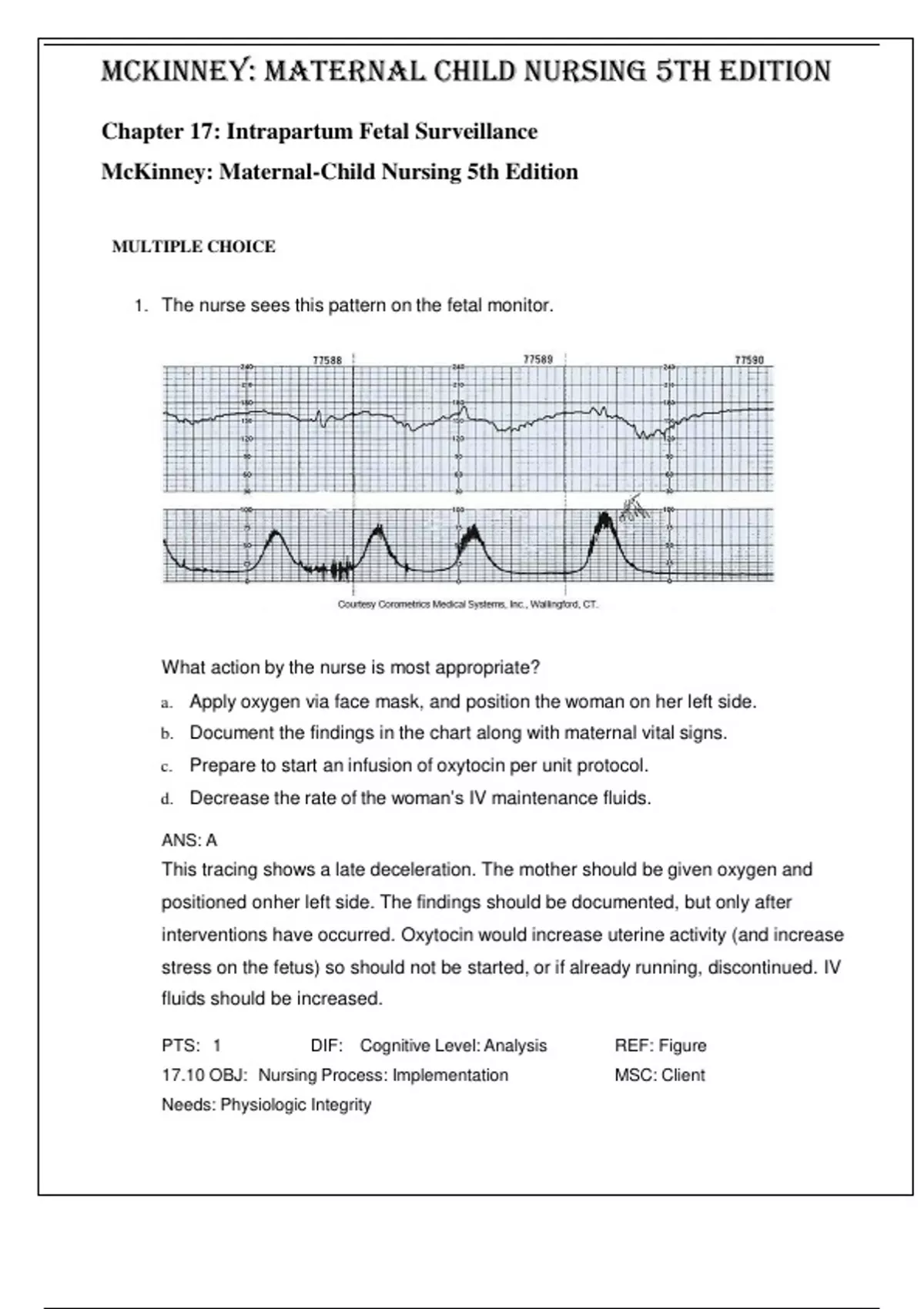 Maternal Child Nursing 5th Edition by McKinney- ISBN- 978-0323401708 TEST BANK Chapter 17: Intrapartum Fetal Surveillance Verified 2024 Practice Questions and 100% Correct Answers with Explanations for Exam Preparation, Graded A+ The nurse sees this pattern on the fetal monitor. What action by the nurse is most appropriate? a. Apply oxygen via face mask, and position the woman on her left side. b. Document the findings in the chart along with maternal vital signs. c. Prepare to start an infusion of oxytocin per unit protocol. d. Decrease the rate of the woman’s IV maintenance fluids. ANS: A This tracing shows a late deceleration. The mother should be given oxygen and positioned onher left side. The findings should be documented, but only after interventions have occurred. Oxytocin would increase uterine activity (and increase stress on the fetus) so should not be started, or if already running, discontinued. IV fluids should be increased. PTS: 1 DIF: Cognitive Level: Analysis REF: Figure 17.10 OBJ: Nursing Process: Implementation MSC: Client Needs: Physiologic Integrity 2. Which maternal condition is considered a contraindication for the application ofinternal monitoring devices? a. Unruptured membranes b. Cervix is dilated to 4 cm c. External monitors are currently being used d. Fetus has a known heart defect ANS: A To apply internal monitoring devices, the membranes must be ruptured. Cervical dilation of 4cm permits the insertion of fetal scalp electrodes and intrauterine catheter. The external monitor can be discontinued after the internal ones are applied. A compromised fetus should be monitored with the most accurate monitoring devices. PTS: 1 DIF: Cognitive Level: Comprehension/UnderstandingREF: p. 338 OBJ: Nursing Process: Planning MSC: Client Needs: Physiologic Integrity