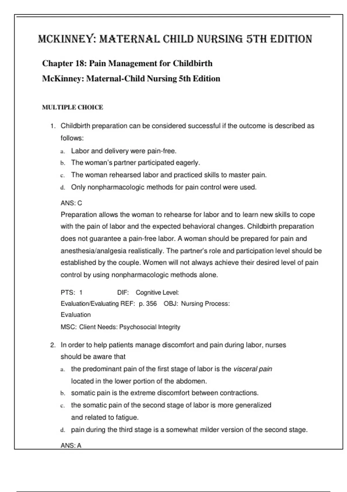 Maternal Child Nursing 5th Edition by McKinney- ISBN- 978-0323401708 TEST BANK Chapter 18: Pain Management for Childbirth Verified 2024 Practice Questions and 100% Correct Answers with Explanations for Exam Preparation, Graded A+ Childbirth preparation can be considered successful if the outcome is described as follows: a. Labor and delivery were pain-free. b. The woman’s partner participated eagerly. c. The woman rehearsed labor and practiced skills to master pain. d. Only nonpharmacologic methods for pain control were used. ANS: C Preparation allows the woman to rehearse for labor and to learn new skills to cope with the pain of labor and the expected behavioral changes. Childbirth preparation does not guarantee a pain-free labor. A woman should be prepared for pain and anesthesia/analgesia realistically. The partner’s role and participation level should be established by the couple. Women will not always achieve their desired level of pain control by using nonpharmacologic methods alone. PTS: 1 DIF: Cognitive Level: Evaluation/Evaluating REF: p. 356 OBJ: Nursing Process: Evaluation MSC: Client Needs: Psychosocial Integrity 2. In order to help patients manage discomfort and pain during labor, nurses should be aware that a. the predominant pain of the first stage of labor is the visceral pain located in the lower portion of the abdomen. b. somatic pain is the extreme discomfort between contractions. c. the somatic pain of the second stage of labor is more generalized and related to fatigue. d. pain during the third stage is a somewhat milder version of the second stage. ANS: A This pain comes from cervical changes, distention of the lower uterine segment, and uterine ischemia. Somatic pain is a faster, sharp pain. Somatic pain is most prominent during late first-stage labor and during second-stage labor as the descending fetus puts direct pressure on maternal tissues. Second-stage labor pain is intense, sharp, burning, and localized. Third- stage labor pain is similar to that of the first stage. PTS: 1 DIF: Cognitive Level: Knowledge/Remembering REF: p. 355 OBJ: Nursing Process: Assessment MSC: Client Needs: Health Promotion and Maintenance