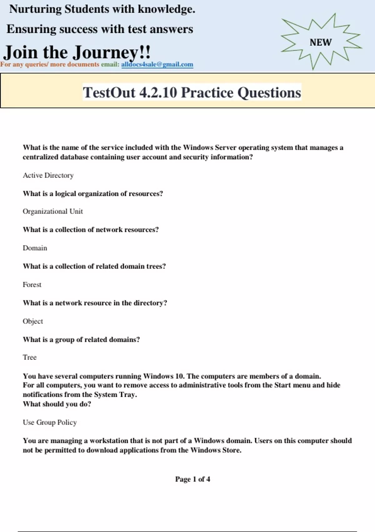 What is the name of the service included with the Windows Server operating system that manages a centralized database containing user account and security information? Active Directory What is a logical organization of resources? Organizational Unit What is a collection of network resources? Domain What is a collection of related domain trees? Forest What is a network resource in the directory? Object What is a group of related domains? Tree You have several computers running Windows 10. The computers are members of a domain. For all computers, you want to remove access to administrative tools from the Start menu and hide notifications from the System Tray. What should you do? Use Group Policy You are managing a workstation that is not part of a Windows domain. Users on this computer should not be permitted to download applications from the Windows Store. TestOut 4.2.10 Practice Questions Page 2 of 4 Nurturing Students with knowledge. Ensuring success with test answers Join the Journey!! For any queries/ more documents email: NEW Which administration tool can you use to enable a policy that turns off the Store application for all users on this computer? Local Group Policy Editor You manage a large number of workstations that belong to a Windows domain. You want to prevent anyone that might try to gain access to a computer from guessing login information by trying multiple passwords. Which GPO contains a policy you can enable to guard all computer in the domain against this security breach? Default Domain Policy A user has complained about not being able to remove a program that is no longer needed on a computer. The Programs and Features page is not available in Control Panel. You suspect that a policy is enabled that hides this page from the user. But after opening the Local Group Policy Editor, you see that the Hide Programs and Features page is set to Not Configured. You know that other users in this domain can access the Programs and Features page. To determine whether the policy is enable, where should you look next? GPOs linked to organizational units that contain this user's object. Causes the policy to be enforced Enabled Does not change the current setting for the policy Not Configured Prevents the policy from being enforced Disabled The Hide Programs and Features page setting is configured for a specific user as follows: Local Group Policy---- Enabled Default Domain Policy GPO --- Not Configured GPO linked to the user's organizational unit --- Disabled