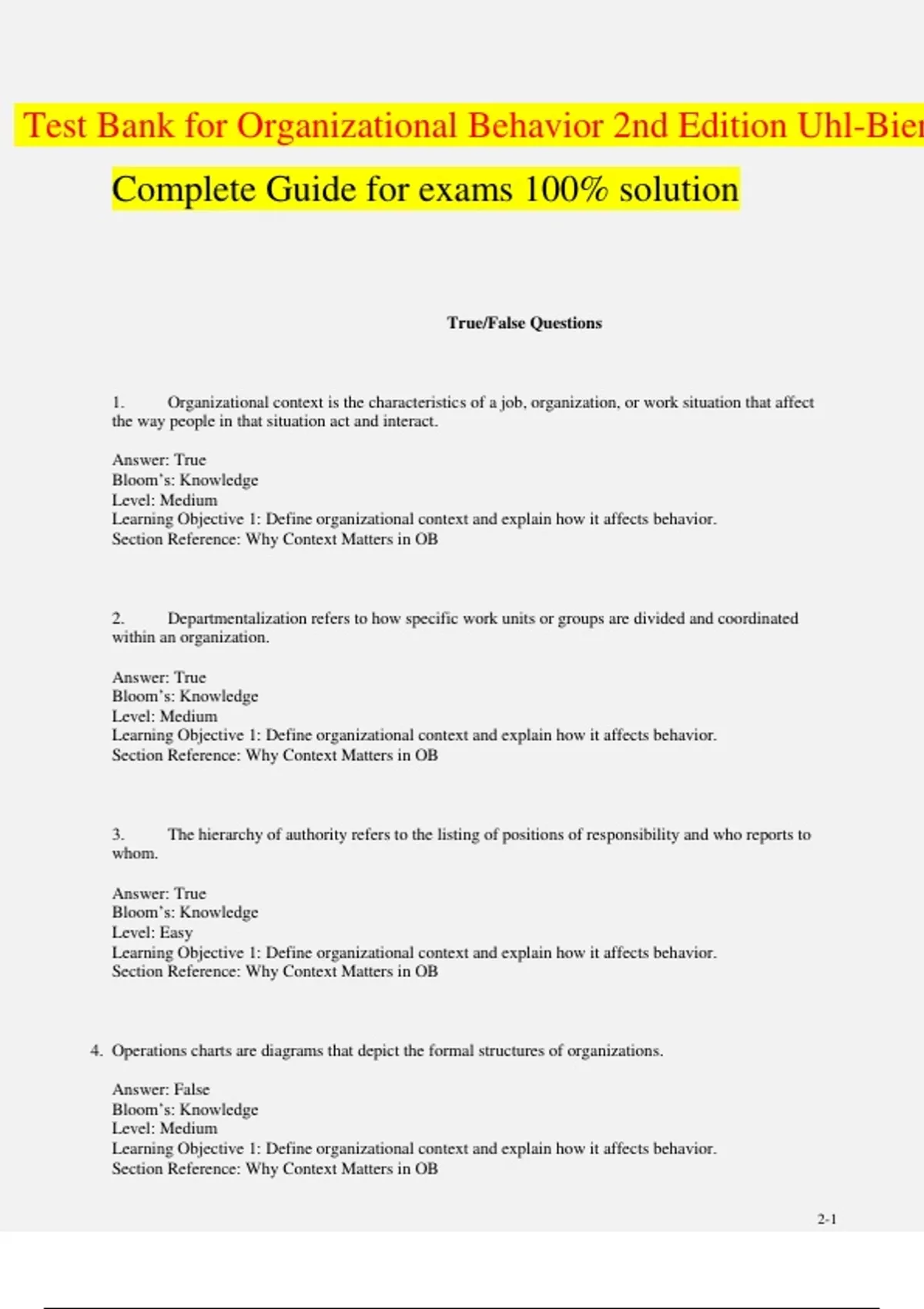 Test Bank for Organizational Behavior 2nd Edition Uhl-Bien Complete Guide for exams 100% solution