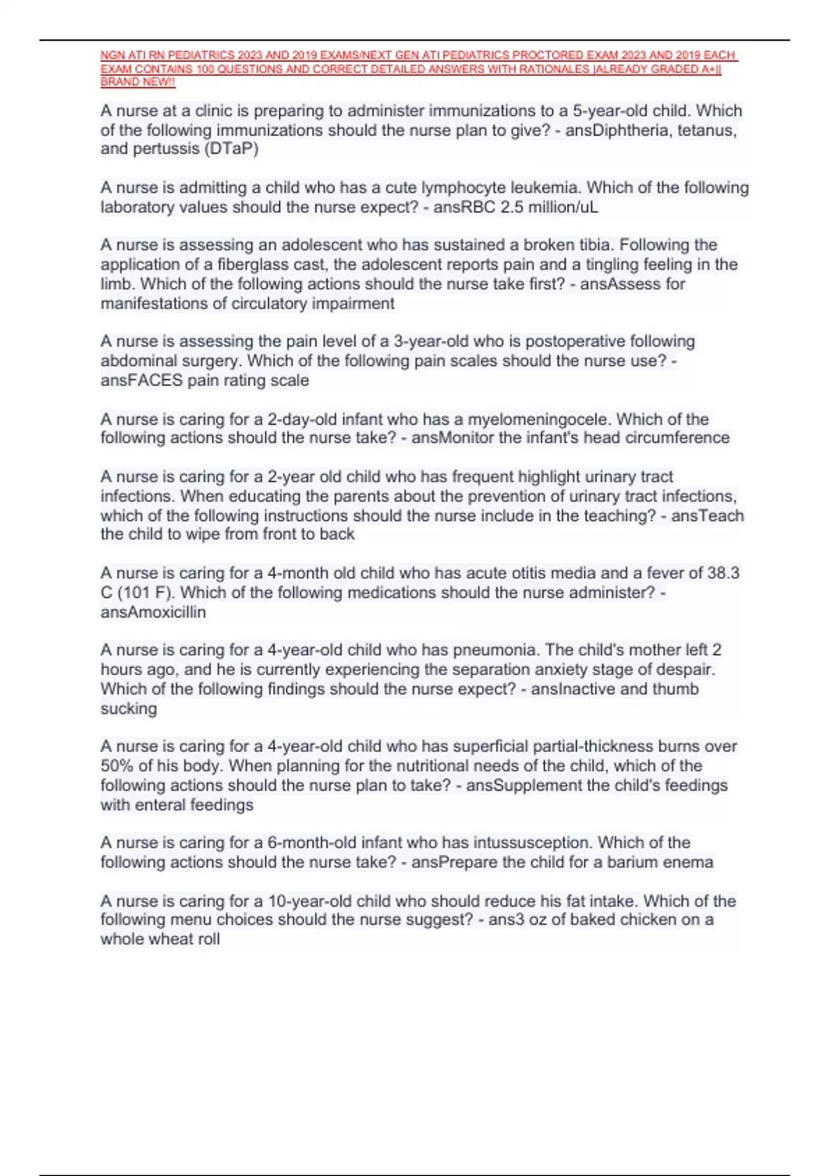 NGN ATI RN PEDIATRICS 2023 AND 2019 EXAMS/NEXT GEN ATI PEDIATRICS PROCTORED EXAM 2023 AND 2019 EACH
