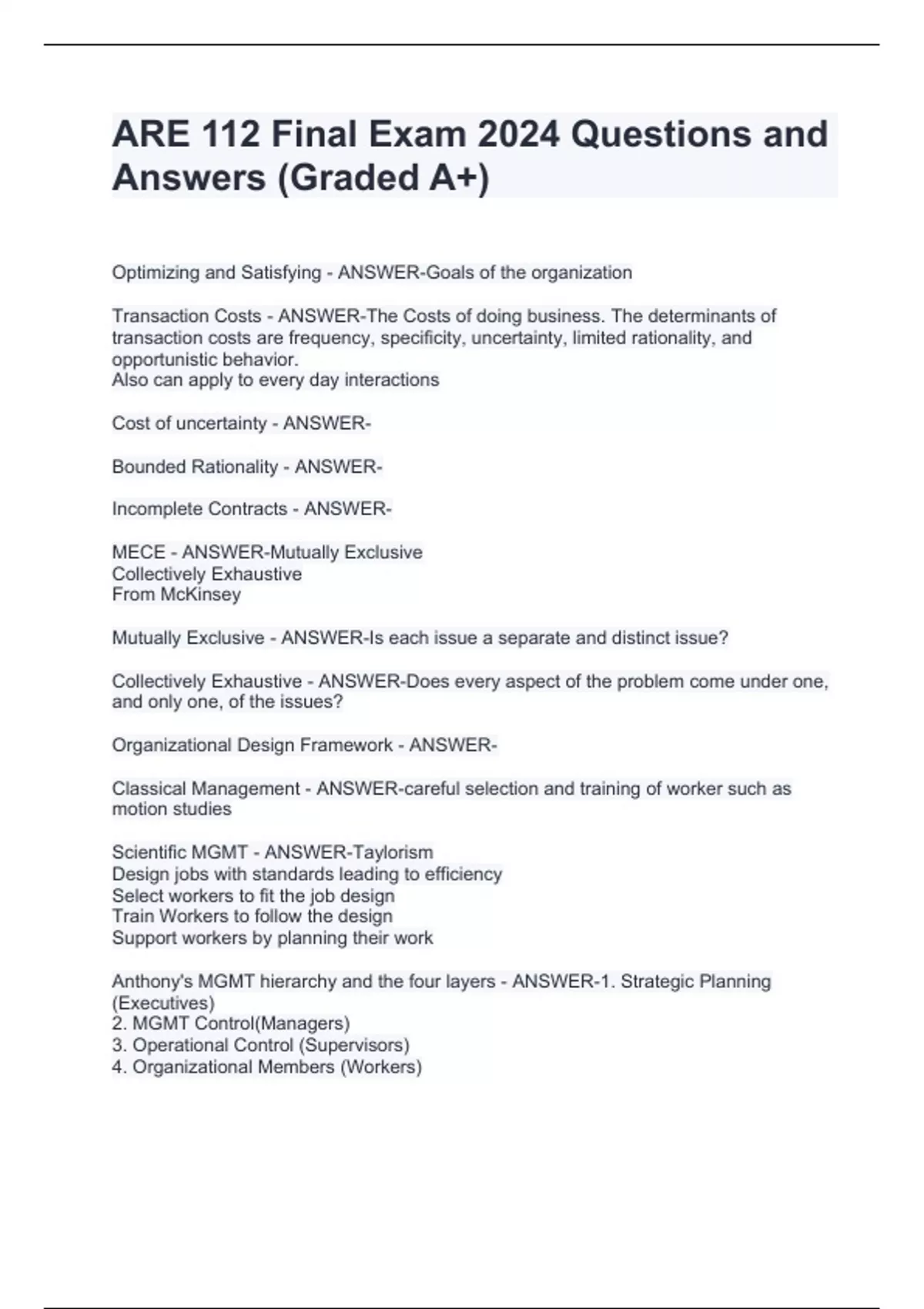Optimizing and Satisfying - ANSWER-Goals of the organization Transaction Costs - ANSWER-The Costs of doing business. The determinants of transaction costs are frequency, specificity, uncertainty, limited rationality, and opportunistic behavior. Also can apply to every day interactions Cost of uncertainty - ANSWER- Bounded Rationality - ANSWER- Incomplete Contracts - ANSWER- MECE - ANSWER-Mutually Exclusive Collectively Exhaustive From McKinsey Mutually Exclusive - ANSWER-Is each issue a separate and distinct issue? Collectively Exhaustive - ANSWER-Does every aspect of the problem come under one, and only one, of the issues? Organizational Design Framework - ANSWER- Classical Management - ANSWER-careful selection and training of worker such as motion studies Scientific MGMT - ANSWER-Taylorism Design jobs with standards leading to efficiency Select workers to fit the job design Train Workers to follow the design Support workers by planning their work Anthony's MGMT hierarchy and the four layers - ANSWER-1. Strategic Planning (Executives) 2. MGMT Control(Managers) 3. Operational Control (Supervisors) 4. Organizational Members (Workers) Maslow's theory of human needs - ANSWER-Physiological Safety Esteem Self-actualization Theory X and Theory Y - ANSWER-X assumes people do not like to work and want to be led Y assumes people are willing to work and can be creative Self fulfilling prophecy MGMT Science Approach - ANSWER-Technology. The application of quantitative tools and applied mathematics to MGMT issues.