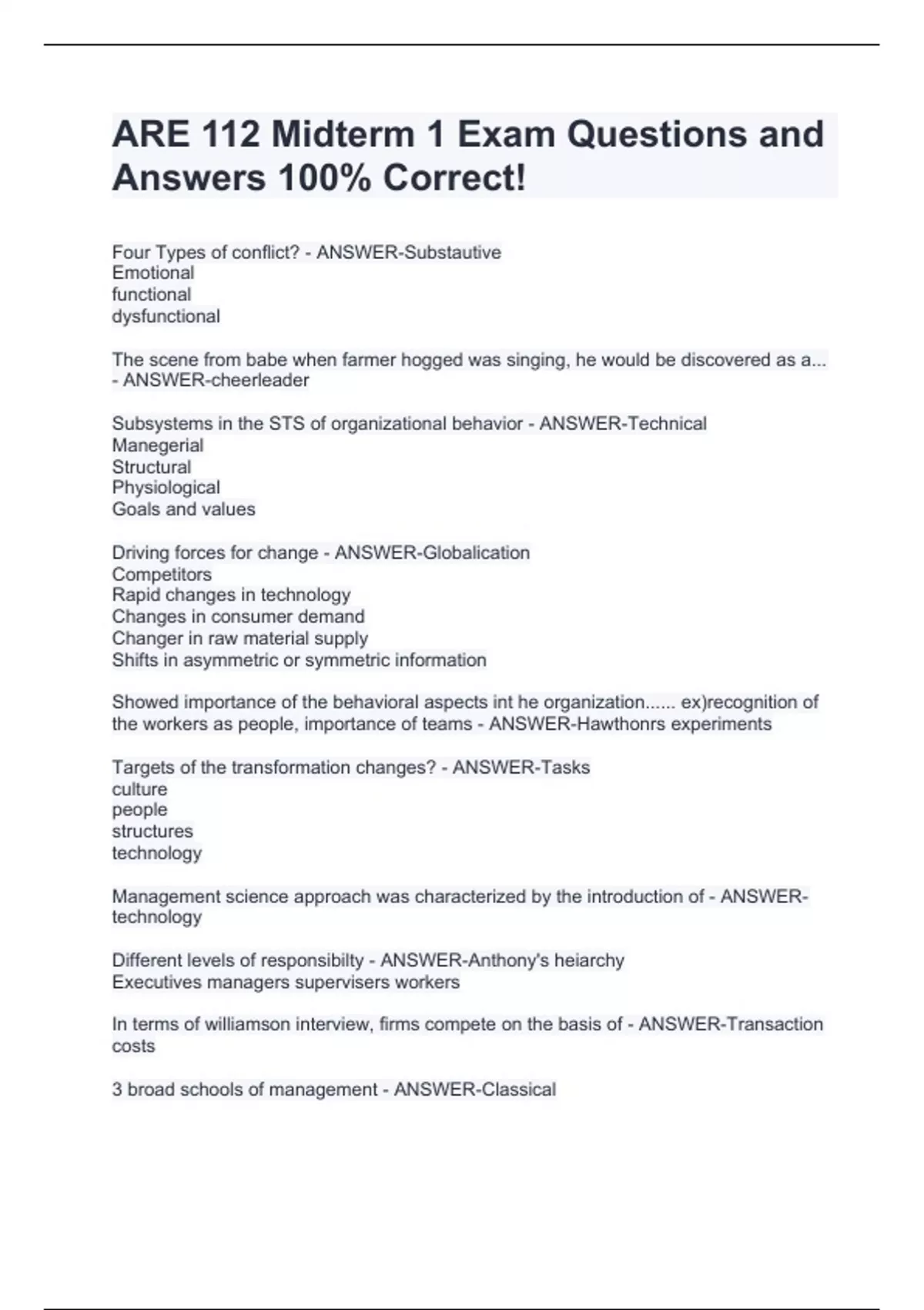 Four Types of conflict? - ANSWER-Substautive Emotional functional dysfunctional The scene from babe when farmer hogged was singing, he would be discovered as a... - ANSWER-cheerleader Subsystems in the STS of organizational behavior - ANSWER-Technical Manegerial Structural Physiological Goals and values Driving forces for change - ANSWER-Globalication Competitors Rapid changes in technology Changes in consumer demand Changer in raw material supply Shifts in asymmetric or symmetric information Showed importance of the behavioral aspects int he organization...... ex)recognition of the workers as people, importance of teams - ANSWER-Hawthonrs experiments Targets of the transformation changes? - ANSWER-Tasks culture people structures technology Management science approach was characterized by the introduction of - ANSWER-technology Different levels of responsibilty - ANSWER-Anthony's heiarchy Executives managers supervisers workers In terms of williamson interview, firms compete on the basis of - ANSWER-Transaction costs 3 broad schools of management - ANSWER-Classical Behavioral management science Conflict resolution types - ANSWER-avoidance
