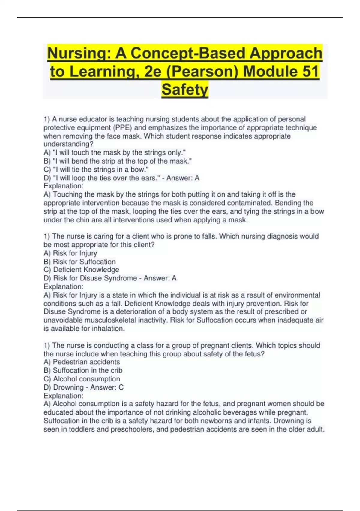 1) A nurse educator is teaching nursing students about the application of personal protective equipment (PPE) and emphasizes the importance of appropriate technique when removing the face mask. Which student response indicates appropriate understanding? A) "I will touch the mask by the strings only." B) "I will bend the strip at the top of the mask." C) "I will tie the strings in a bow." D) "I will loop the ties over the ears." - Answer: A Explanation: A) Touching the mask by the strings for both putting it on and taking it off is the appropriate intervention because the mask is considered contaminated. Bending the strip at the top of the mask, looping the ties over the ears, and tying the strings in a bow under the chin are all interventions used when applying a mask. 1) The nurse is caring for a client who is prone to falls. Which nursing diagnosis would be most appropriate for this client? A) Risk for Injury B) Risk for Suffocation C) Deficient Knowledge D) Risk for Disuse Syndrome - Answer: A Explanation: A) Risk for Injury is a state in which the individual is at risk as a result of environmental conditions such as a fall. Deficient Knowledge deals with injury prevention. Risk for Disuse Syndrome is a deterioration of a body system as the result of prescribed or unavoidable musculoskeleta