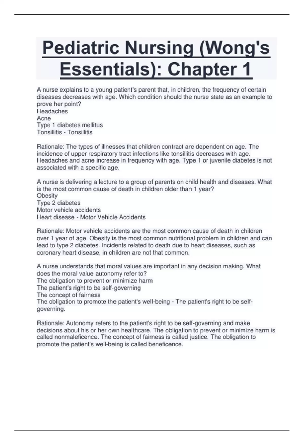 A nurse explains to a young patient's parent that, in children, the frequency of certain diseases decreases with age. Which condition should the nurse state as an example to prove her point? Headaches Acne Type 1 diabetes mellitus Tonsillitis - Tonsillitis Rationale: The types of illnesses that children contract are dependent on age. The incidence of upper respiratory tract infections like tonsillitis decreases with age. Headaches and acne increase in frequency with age. Type 1 or juvenile diabetes is not associated with a specific age. A nurse is delivering a lecture to a group of parents on child health and diseases. What is the most common cause of death in children older than 1 year? Obesity Type 2 diabetes Motor vehicle accidents Heart disease - Motor Vehicle Accidents Rationale: Motor vehicle accidents are the most common cause of death in children over 1 year of age. Obesity is the most common nutritional problem in children and can lead to type 2 diabetes. Incidents related to death due to heart diseases, such as coronary heart disease, in children are not that common.