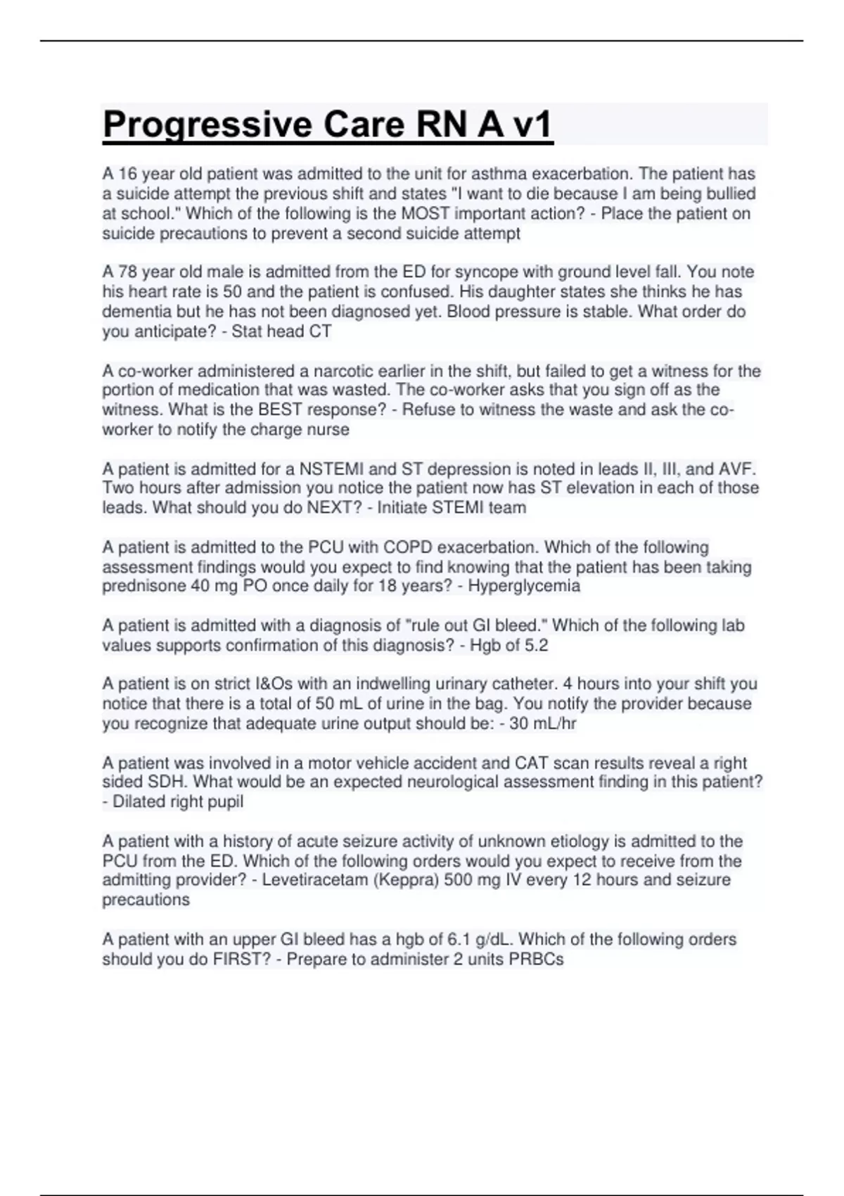 A 16 year old patient was admitted to the unit for asthma exacerbation. The patient has a suicide attempt the previous shift and states "I want to die because I am being bullied at school." Which of the following is the MOST important action? - Place the patient on suicide precautions to prevent a second suicide attempt A 78 year old male is admitted from the ED for syncope with ground level fall. You note his heart rate is 50 and the patient is confused. His daughter states she thinks he has dementia but he has not been diagnosed yet. Blood pressure is stable. What order do you anticipate? - Stat head CT A co-worker administered a narcotic earlier in the shift, but failed to get a witness for the portion of medication that was wasted. The co-worker asks that you sign off as the witness. What is the BEST response? - Refuse to witness the waste and ask the coworker to notify the charge nurse A patient is admitted for a NSTEMI