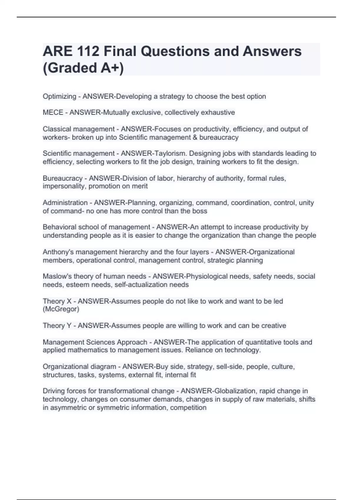 Optimizing - ANSWER-Developing a strategy to choose the best option MECE - ANSWER-Mutually exclusive, collectively exhaustive Classical management - ANSWER-Focuses on productivity, efficiency, and output of workers- broken up into Scientific management & bureaucracy Scientific management - ANSWER-Taylorism. Designing jobs with standards leading to efficiency, selecting workers to fit the job design, training workers to fit the design. Bureaucracy - ANSWER-Division of labor, hierarchy of authority, formal rules, impersonality, promotion on merit Administration - ANSWER-Planning, organizing, command, coordination, control, unity of command- no one has more control than the boss Behavioral school of management - ANSWER-An attempt to increase productivity by understanding people as it is easier to change the organization than change the people Anthony's management hierarchy and the four layers - ANSWER-Organizational members, operational control, management control, strategic planning Maslow's theory of human needs - ANSWER-Physiological needs, safety needs, social needs, esteem needs, self-actualization needs Theory X - ANSWER-Assumes people do not like to work and want to be led (McGregor)
