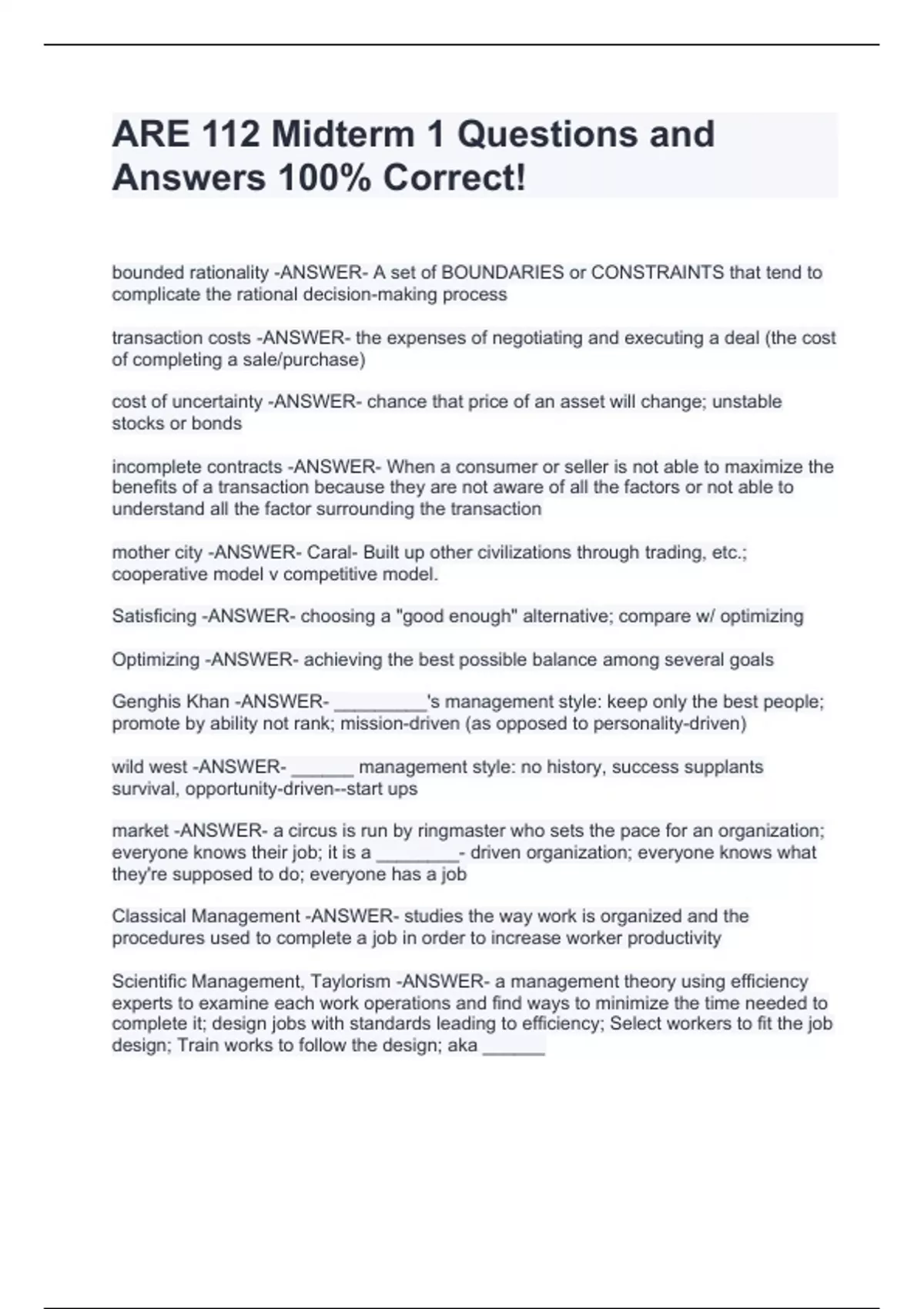 bounded rationality -ANSWER- A set of BOUNDARIES or CONSTRAINTS that tend to complicate the rational decision-making process transaction costs -ANSWER- the expenses of negotiating and executing a deal (the cost of completing a sale/purchase) cost of uncertainty -ANSWER- chance that price of an asset will change; unstable stocks or bonds incomplete contracts -ANSWER- When a consumer or seller is not able to maximize the benefits of a transaction because they are not aware of all the factors or not able to understand all the factor surrounding the transaction mother city -ANSWER- Caral- Built up other civilizations through trading, etc.; cooperative model v competitive model. Satisficing -ANSWER- choosing a "good enough" alternative; compare w/ optimizing Optimizing -ANSWER- achieving the best possible balance among several goals Genghis Khan -ANSWER- _________'s management style: keep only the best people; promote by ability not rank; mission-driven (as opposed to personality-driven)