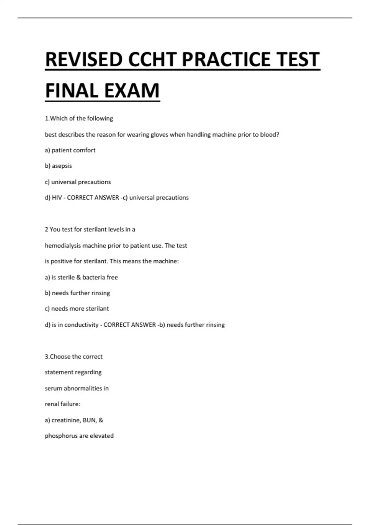 REVISED CCHT PRACTICE TEST FINAL EXAM 1.Which of the following best describes the reason for wearing gloves when handling machine prior to blood? a) patient comfort b) asepsis c) universal precautions d) HIV - CORRECT ANSWER -c) universal precautions 2 You test for sterilant levels in a hemodialysis machine prior to patient use. The test is positive for sterilant. This means the machine: a) is sterile & bacteria free b) needs further rinsing c) needs more sterilant d) is in conductivity - CORRECT ANSWER -b) needs further rinsing 3.Choose the correct statement regarding serum abnormalities in renal failure: a) creatinine, BUN, & phosphorus are elevated