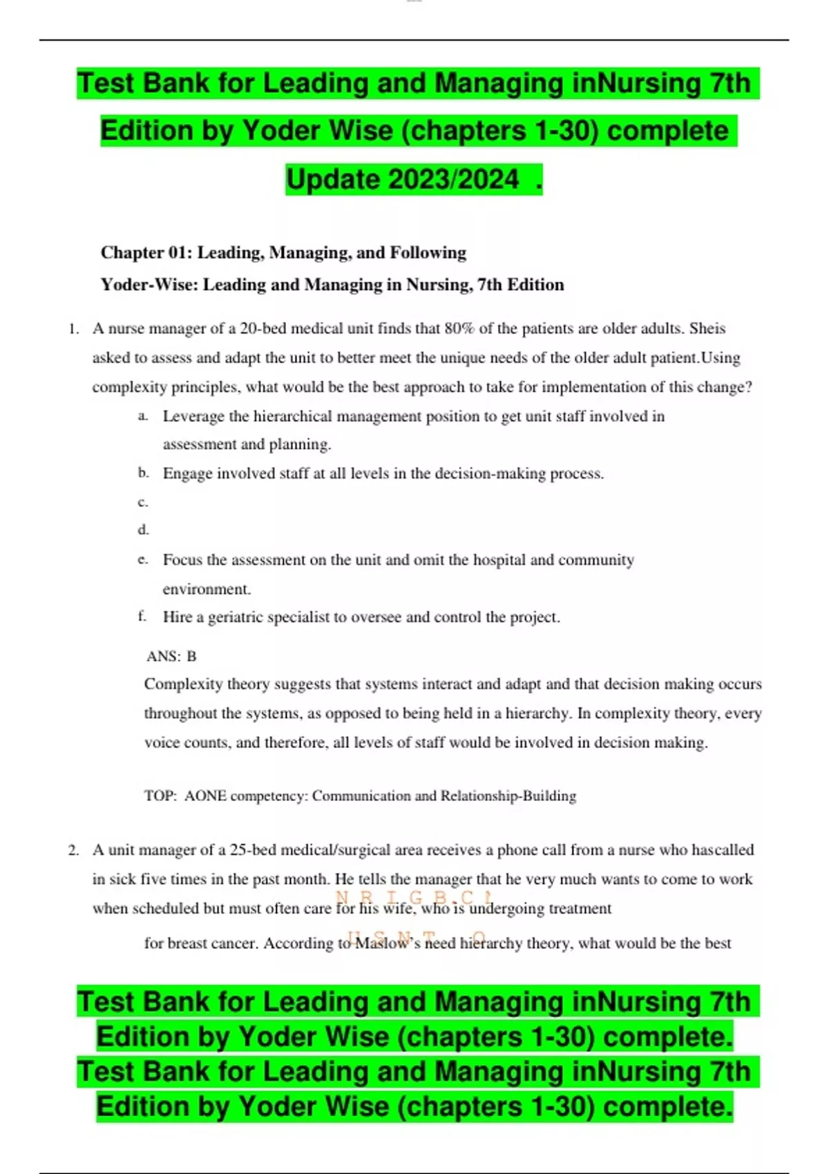 Chapter 01: Leading, Managing, and Following Yoder-Wise: Leading and Managing in Nursing, 7th Edition 1. A nurse manager of a 20-bed medical unit finds that 80% of the patients are older adults. Sheis asked to assess and adapt the unit to better meet the unique needs of the older adult patient.Using complexity principles, what would be the best approach to take for implementation of this change? a. Leverage the hierarchical management position to get unit staff involved in assessment and planning. b. Engage involved staff at all levels in the decision-making process. c. d. e. Focus the assessment on the unit and omit the hospital and communit