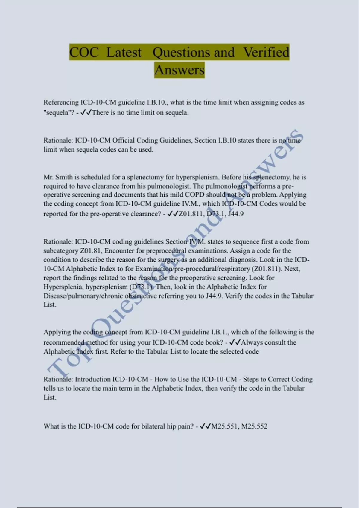 Referencing ICD-10-CM guideline I.B.10., what is the time limit when assigning codes as "sequela"? - There is no time limit on sequela. Rationale: ICD-10-CM Official Coding Guidelines, Section I.B.10 states there is no time limit when sequela codes can be used. Mr. Smith is scheduled for a splenectomy for hypersplenism. Before his splenectomy, he is required to have clearance from his pulmonologist. The pulmonologist performs a preoperative screening and documents that his mild COPD should not be a problem. Applying the coding concept from ICD-10-CM guideline IV.M., which ICD-10-CM Codes would be reported for the pre-operative clearance? - Z01.811, D73.1, J44.9 Rationale: ICD-10-CM coding guidelines Section IV.M. states to sequence first a code from subcategory Z01.81, Encounter for preprocedural examinations. Assign a code for the condition to describe the reason for the surgery as an additional diagnosis. Look in the ICD10-CM Alphabetic Index to for Examination/pre-procedural/respiratory (Z01.811). Next, report the findings related to the reason for the preoperative screening. Look for Hypersplenia, hypersplenism (D73.1). Then, look in the Alphabetic Index for Disease/pulmonary/chronic obstructive referring you to J44.9. Verify the codes in the Tabular List. Applying the coding concept from ICD-10-CM guideline I.B.1., which of the following is the recommended method for using your ICD-10-CM code book? - Always consult the Alphabetic Index first. Refer to the Tabular List to locate the selected code Rationale: Introduction ICD-10-CM - How to Use the ICD-10-CM - Steps to Correct Coding tells us to locate the main term in the Alphabetic Index, then verify the code in the Tabular List. What is the ICD-10-CM code for bilateral hip pain? - M25.551, M25.552 Rationale: In the Index to Diseases and Injuries, look for Pain(s)/ joint/hip. You are directed to subcategory code M25.55. In the Tabular List, a sixth character is assigned to indicate laterality. Because there is no code choice for bilateral, M25.551 is reported for the right hip pain and M25.552 is reported for the left hip pain. What is the ICD-10-CM code for a bruised left knee, initial encounter? - S80.02XA Rationale: In the Index to Diseases and Injuries, look for the main term Bruise. You are directed to see also Contusion. Look for the main term Contusion, locate the site, subterm, knee and you are referred to S80.0-. Review in Tabular List. There is a fifth character symbol in front of subcategory code S80.0 to indicate the laterality of the contusion. The contusion is on the left knee, reporting so far S80.02. There is a symbol for 7th, X, extension character, indicating you need to report two more characters to complete this code. Because you only have so far five characters, S80.02, you need to report an "X" as a dummy placeholder for your sixth character and then an "A" to indicate initial encounter for your seventh character. There is an instructional note under category code S80 that indicates which letters can only be used as the 7th character. Correct code choice is S80.02XA. Supplementary words enclosed in parentheses in the ICD-10-CM coding manual have what affect on the coding? Refer to ICD-10-CM guideline I.A.7. - They do not affect code assignment. Rationale: Parentheses are used in both the ICD-10-CM Alphabetic Index and Tabular List to enclose supplementary words that may be present in the statement of a disease or procedure without affecting the code number to which it is assigned. The terms within the parentheses are referred to as nonessential modifiers. A patient visits her family provider for her annual wellness exam. The provider notices a suspicious skin lesion on her arm and refers her to a dermatologist. Applying the coding concept from ICD-10-CM guideline IV.P, which ICD-10-CM code(s) is/are reported? - Z00.01, L98.9 Rationale: ICD-10-CM coding guidelines, section IV.P. requires the coder to report first the general medical exam diagnosis and then the abnormal finding. Look in the ICD-10-CM Alphabetic Index for Examination (for) (following) (general) (of) (routine)/annual (adult) (periodic) (physical)/with abnormal findings Z00.01. In the Tabular List, there is a note to also report the code to identify the abnormal finding. Look in the ICD-10-CM Alphabetic Index for Lesion/Skin L98.9. Verify code selection in the Tabular List.