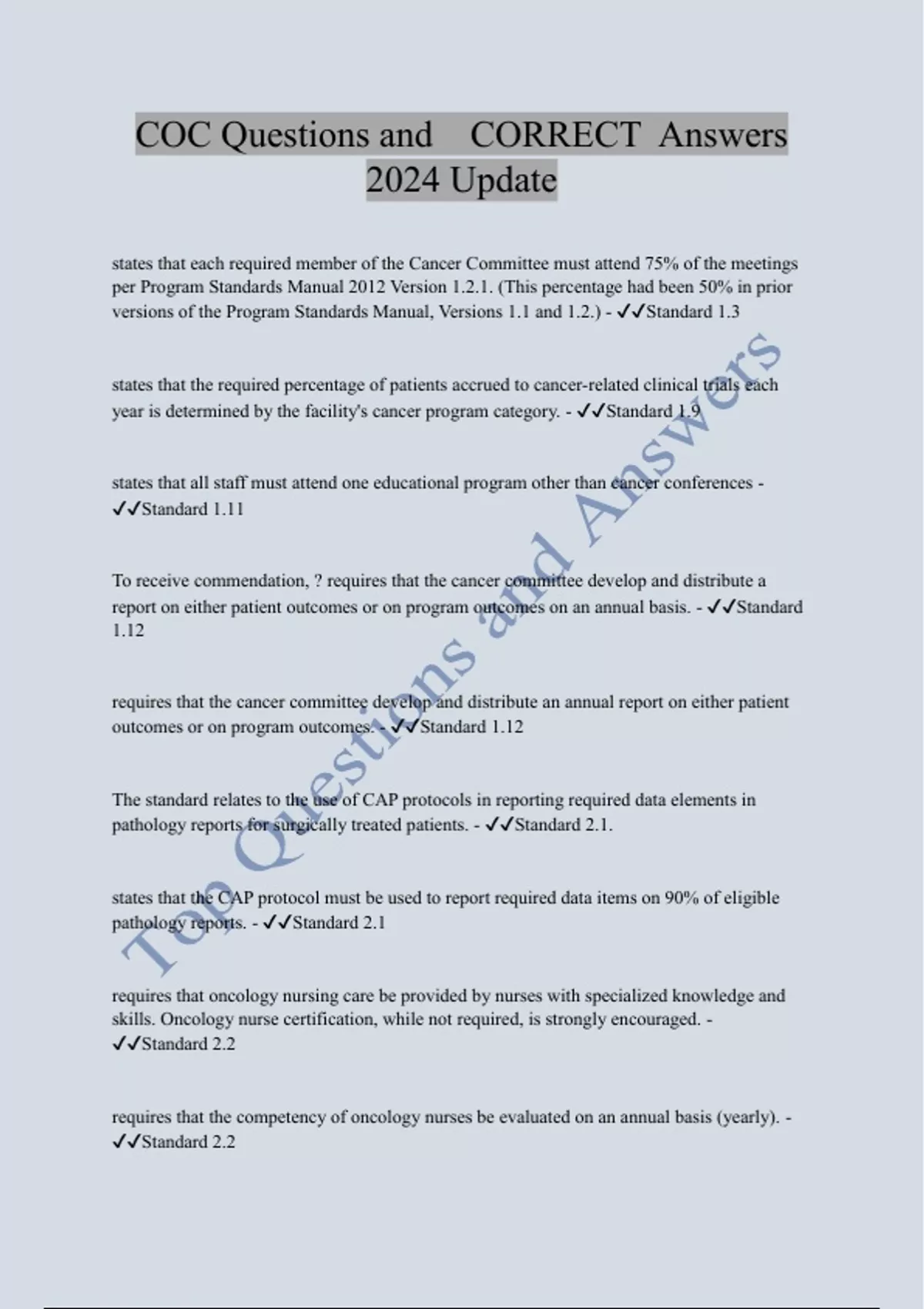 states that each required member of the Cancer Committee must attend 75% of the meetings per Program Standards Manual 2012 Version 1.2.1. (This percentage had been 50% in prior versions of the Program Standards Manual, Versions 1.1 and 1.2.) - Standard 1.3 states that the required percentage of patients accrued to cancer-related clinical trials each year is determined by the facility's cancer program category. - Standard 1.9 states that all staff must attend one educational program other than cancer conferences - Standard 1.11 To receive commendation, ? requires that the cancer committee develop and distribute a report on either patient outcomes or on program outcomes on an annual basis. - Standard 1.12 requires that the cancer committee develop and distribute an annual report on either patient outcomes or on program outcomes. - Standard 1.12 The standard relates to the use of CAP protocols in reporting required data elements in pathology reports for surgically treated patients. - Standard 2.1. states that the CAP protocol must be used to report required data items on 90% of eligible pathology reports. - Standard 2.1 requires that oncology nursing care be provided by nurses with specialized knowledge and skills. Oncology nurse certification, while not required, is strongly encouraged. - Standard 2.2 requires that the competency of oncology nurses be evaluated on an annual basis (yearly). - Standard 2.2 the submission window for all 2013 cases to the National Cancer Data Base (NCDB) opens January 1, 2015 and closes January 31, 2015 (due by midnight Central time). - Per Standard 5.6 states that resubmitted data starting from January 1, 2003 forward must meet the established quality criteria and resubmission deadline specified in the Call for Data. - Standard 5.6 states the quality improvement coordinator reports annually to the cancer committee. The standard also indicates a cancer registrar who is abstracting cases cannot be selected to fulfill this role. - Standard 1.2 states within the paragraph under Cancer Registry Quality Coordinator that a cancer registrar who is abstracting can be selected to fill this role. The standard also indicates that the Cancer Registry Quality Coordinator uses the registry data as a basis to monitor the quality of patient care. - Standard 1.2 states that goals are not to be a restatement of a CoC standard because compliance with a standard is required. While new programmatic and clinical goals are to be established annually, these goals do not need to be completed within the year and may be carried forward into the next year. - Standard 1.5 states the cancer committee must establish, implement, and monitor at least one clinical goal related to cancer care annually. - Standard 1.5 states that activities related to goals do not have to be completed each year, but a report of activities related to those goals must be documented in the cancer committee minutes at least twice a year. - Standard 1.5 requires that the cancer committee annually establish and implement a plan to evaluate the cancer registry data. - Standard 1.6 states that community outreach programs (prevention or screening/early detection) must be monitored and reported to the cancer committee annually. - Standard 1.8