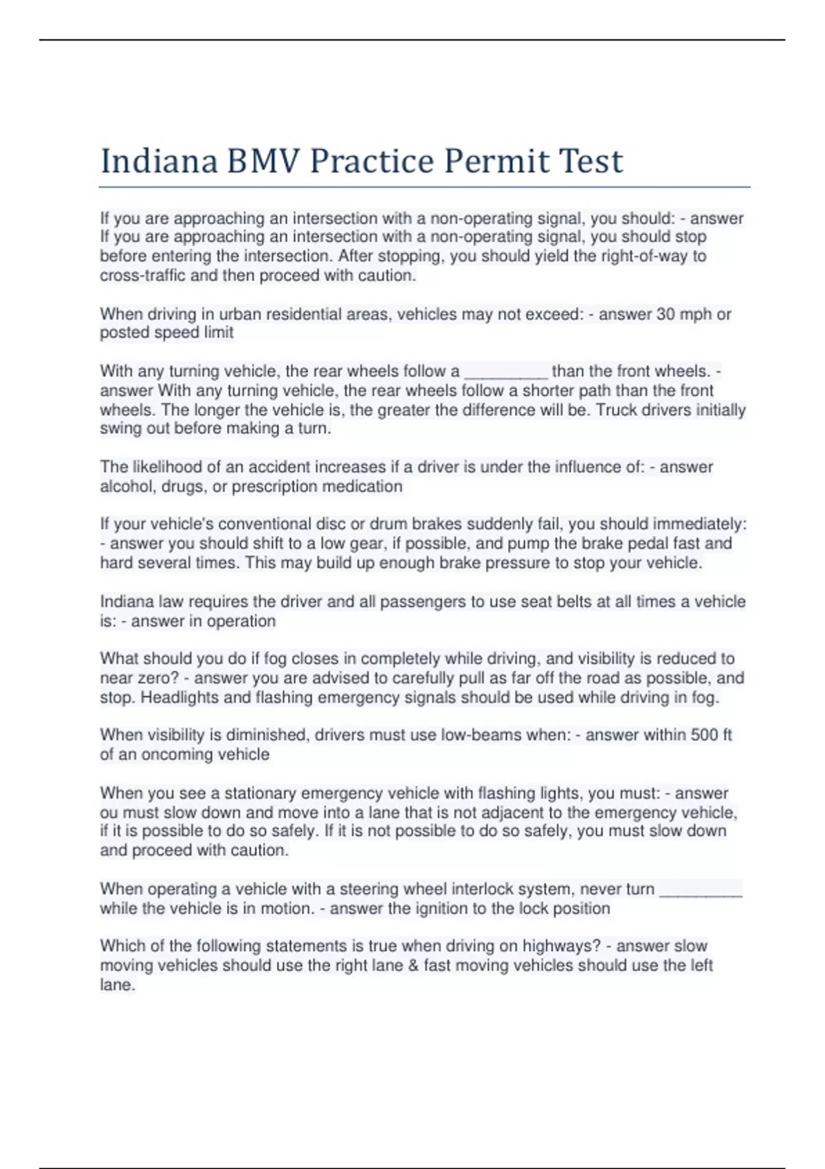 If you are approaching an intersection with a non-operating signal, you should: - answer If you are approaching an intersection with a non-operating signal, you should stop before entering the intersection. After stopping, you should yield the right-of-way to cross-traffic and then proceed with caution. When driving in urban residential areas, vehicles may not exceed: - answer 30 mph or posted speed limit With any turning vehicle, the rear wheels follow a _________ than the front wheels. - answer With any turning vehicle, the rear wheels follow a shorter path than the front wheels. The longer the vehicle is, the greater the difference will be. Truck drivers initially swing out before making a turn. The likelihood of an accident increases if a driver is under the influence of: - answer alcohol, drugs, or prescription medication If your vehicle's conventional disc or drum brakes suddenly fail, you should immediately: - answer you should shift to a low gear, if possible, and pump the brake pedal fast and hard several times. This may build up enough brake pressure to stop your vehicle. Indiana law requires the driver and all passengers to use seat belts at all times a vehicle is: - answer in operation What should you do if fog closes in completely while driving, and visibility is reduced to near zero? - answer you are advised to carefully pull as far off the road as possible, and stop. Headlights and flashing emergency signals should be used while driving in fog. When visibility is diminished, drivers must use low-beams when: - answer within 500 ft of an oncoming vehicle When you see a stationary emergency vehicle with flashing lights, you must: - answer ou must slow down and move into a lane that is not adjacent to the emergency vehicle, if it is possible to do so safely. If it is not possible to do so safely, you must slow down and proceed with caution. When operating a vehicle with a steering wheel interlock system, never turn _________ while the vehicle is in motion. - answer the ignition to the lock position Which of the following statements is true when driving on highways? - answer slow moving vehicles should use the right lane & fast moving vehicles should use the left lane. If you are involved in an accident, you must: - answer provide information to other vehicles involved and get help for injured parties When making a U-turn, you must NOT: - answer make it on the curve of a road or near a hill Defensive drivers stay _________ behind the vehicle ahead while driving. - answer A good rule for drivers to follow is to stay at least two to three seconds behind the vehicle ahead. When following a vehicle, watch for the vehicle ahead to pass a fixed object and estimate how much time elapses before you pass the same object. If another vehicle is passing you on the left-hand side of the road, allow the other vehicle to pass safely, and: - answer do not increase your speed. The maximum speed limit in a highway work zone must not exceed: - answer 45 mph in any location To avoid the effects of glare of the oncoming headlights, the driver should not look directly into the lights of an approaching vehicle, but instead: - answer focus on the right side of the road If a tornado is nearby, you must: - answer stop, exit vehicle, go to low-lying area It is dangerous and illegal to try to pass other vehicles when _________ of an intersection, railroad crossing, bridge, viaduct or tunnel. - answer Passing other vehicles is prohibited when you are within 100 feet of an intersection, railroad crossing, bridge, viaduct or tunnel. If the speed limit is 50 mph or greater, you must give proper turn signal ________ before turning or changing lanes. - answer You must give a proper turn signal at least 200 feet before turning or changing lanes. If the speed limit is 50 mph or more, you must give a proper turn signal at least 300 feet before turning or changing lanes. If you are driving near a school, you must slow down to _________ for the school zone. - answer the lowest posted speed limit The first rule of a safe and legal turn is: - answer move into proper lane well before the turn If you are approaching a stop sign, you must: - answer stop at the solid white line A red flashing light at an intersection is equivalent to: - answer a stop sign You must avoid _________ while crossing railroad tracks. - answer stopping or shifting gears Flashing arrow boards are often used to indicate: - answer a detour ahead When you enter a roundabout or a circular intersection, you must proceed: - answer in a counter-clockwise direction A yield sign indicates that a driver must slow down when approaching an intersection and _________ if a vehicle or pedestrian with the right-of-way is approaching from another direction. - answer be prepared to stop In a situation with a flat tire or blow-out, you should first: - answer hold the steering wheel firmly When you enter an interstate on-ramp, you must stay to the right and _________ to allow your car to merge with traffic. - answer increase your speed in the acceleration lane You must avoid driving next to other vehicles on multi-lane roads because: - answer someone may crowd your lane You should not pass under the following conditions, except: - answer your lane is separated by a broken yellow line When overtaking and passing another vehicle on a two-lane road, you should pass only to: - answer the left of the vehicle __________are made to stop runaway vehicles safely without injuring drivers and passengers on steep mountain grades. - answer escape ramps When you are following a vehicle which makes frequent stops, you should allow _________ than usual. - answer more following distance A red arrow at an intersection indicates that: - answer turning traffic must stop If you are stopped at a traffic light and another vehicle is approaching you from behind at a high speed, you should: - answer pull your vehicle forward When driving on gravel or dirt, you must slow down because: - answ