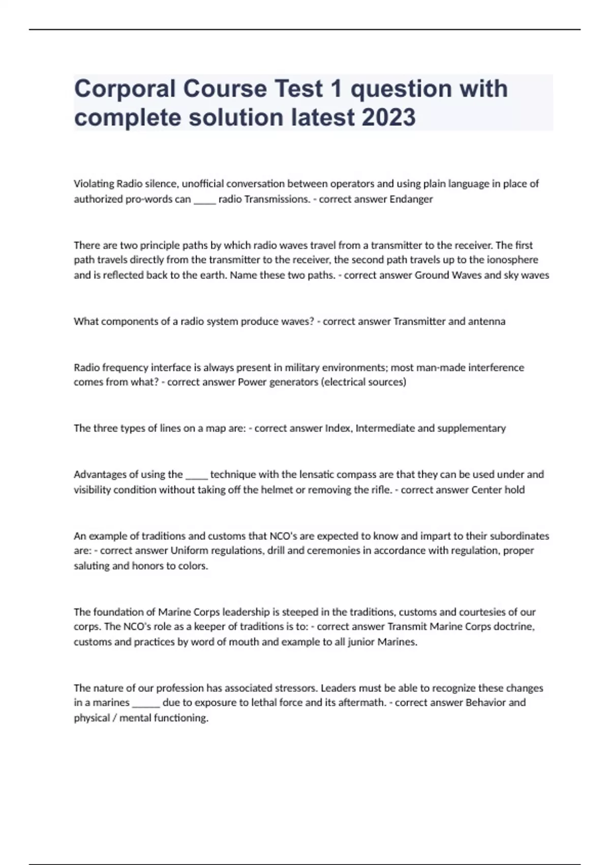 Corporal Course Test 1 question with complete solution 2024Violating Radio silence, unofficial conversation between operators and using plain language in place of authorized pro-words can ____ radio Transmissions. - correct answer Endanger There are two principle paths by which radio waves travel from a transmitter to the receiver. The first path travels directly from the transmitter to the receiver, the second path travels up to the ionosphere and is reflected back to the earth. Name these two paths. - correct answer Ground Waves and sky waves What components of a radio system produce waves? - correct answer Transmitter and antenna Radio frequency interface is always present in military environments; most man-made interference comes from what? - correct answer Power generators (electrical sources) The three types of lines on a map are: - correct answer Index, Intermediate and supplementary Advantages of using the ____ technique with the lensatic compass are that they can be used under and visibility condition without taking off the helmet or removing the rifle. - correct answer Center hold An example of traditions and customs that NCO's are expected to know and impart to their subordinates are: - correct answer Uniform regulations, drill and ceremonies in accordance with regulation, proper saluting and honors to colors. The foundation of Marine Corps leadership is steeped in the traditions, customs and courtesies of our corps. The NCO's role as a kee