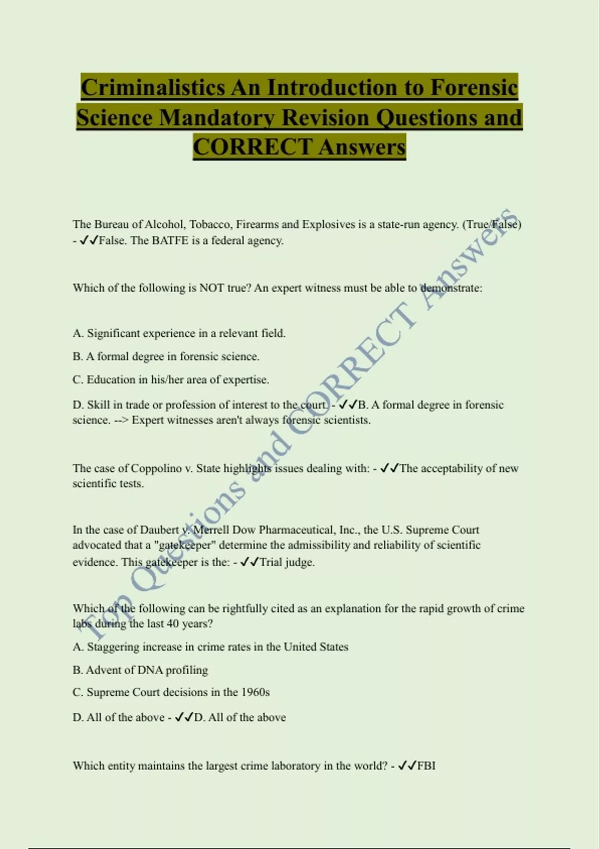 The Bureau of Alcohol, Tobacco, Firearms and Explosives is a state-run agency. (True/False) - False. The BATFE is a federal agency. Which of the following is NOT true? An expert witness must be able to demonstrate: A. Significant experience in a relevant field. B. A formal degree in forensic science. C. Education in his/her area of expertise. D. Skill in trade or profession of interest to the court. - B. A formal degree in forensic science. --> Expert witnesses aren't always forensic scientists. The case of Coppolino v. State highlights issues dealing with: - The acceptability of new scientific tests. In the case of Daubert v. Merrell Dow Pharmaceutical, Inc., the U.S. Supreme Court advocated that a "gatekeeper" determine the admissibility and reliability of scientific evidence. This gatekeeper is the: - Trial judge. Which of the following can be rightfully cited as an explanation for the rapid growth of crime labs during the last 40 years? A. Staggering increase in crime rates in the United States B. Advent of DNA profiling C. Supreme Court decisions in the 1960s D. All of the above - D. All of the above Which entity maintains the largest crime laboratory in the world? - FBI
