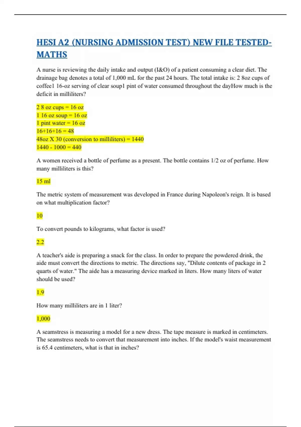 HESI A2 (NURSING ADMISSION TEST) NEW FILE TESTED- MATHS