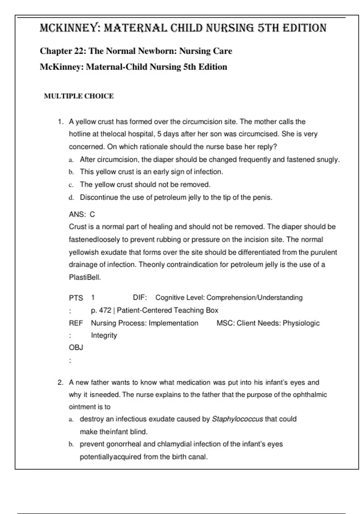 Maternal Child Nursing 5th Edition by McKinney- ISBN- 978-0323401708 TEST BANK Chapter 22: The Normal Newborn: Nursing Care Verified 2024 Practice Questions and 100% Correct Answers with Explanations for Exam Preparation, Graded A+ A yellow crust has formed over the circumcision site. The mother calls the hotline at thelocal hospital, 5 days after her son was circumcised. She is very concerned. On which rationale should the nurse base her reply? a. After circumcision, the diaper should be changed frequently and fastened snugly. b. This yellow crust is an early sign of infection. c. The yellow crust should not be removed. d. Discontinue the use of petroleum jelly to the tip of the penis. ANS: C Crust is a normal part of healing and should not be removed. The diaper should be fastenedloosely to prevent rubbing or pressure on the incision site. The normal yellowish exudate that forms over the site should be differentiated from the purulent drainage of infection. Theonly contraindication for petroleum jelly is the use of a PlastiBell. PTS : REF : OBJ : 1 DIF: Cognitive Level: Comprehension/Understanding p. 472 | Patient-Centered Teaching Box Nursing Process: Implementation MSC: Client Needs: Physiologic Integrity 2. A new father wants to know what medication was put into his infant’s eyes and why it isneeded. The nurse explains to the father that the purpose of the ophthalmic ointment is to a. destroy an infectious exudate caused by Staphylococcus that could make theinfant blind. b. prevent gonorrheal and chlamydial infection of the infant’s eyes potentiallyacquired from the birth canal. c. prevent potentially harmful exudate from invading the tear ducts of the infant’seyes, leading to dry eyes. d. prevent the infant’s eyelids from sticking together and help the infant see. ANS: B The ointment is used to prevent potential gonorrheal and chlamydial infection of the infant’seyes. PTS: 1 DIF: Cognitive Level: Comprehension/Understanding REF: p. 462 OBJ: Integrated Process: Teaching-Learning MSC: Client Needs: Physiologic Integrity