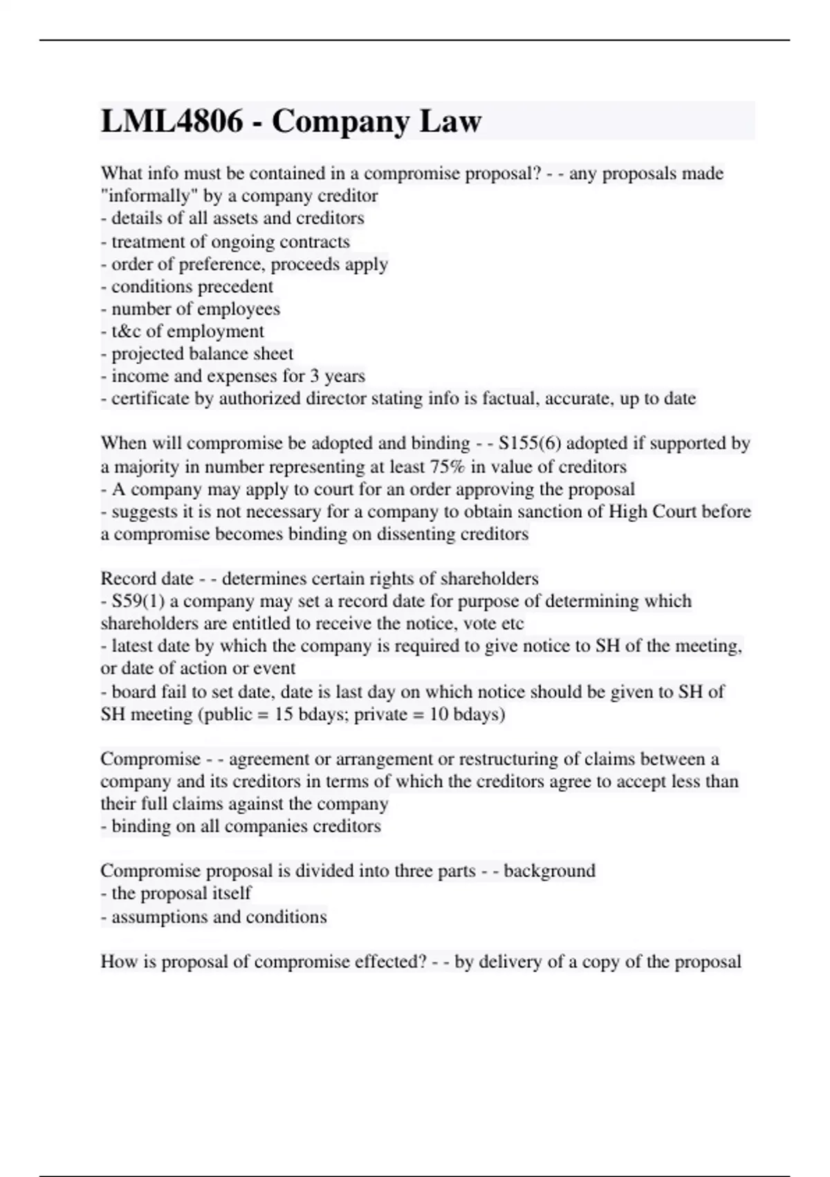 What info must be contained in a compromise proposal? - - any proposals made "informally" by a company creditor - details of all assets and creditors - treatment of ongoing contracts - order of preference, proceeds apply - conditions precedent - number of employees - t&c of employment - projected balance sheet - income and expenses for 3 years - certificate by authorized director stating info is factual, accurate, up to date When will compromise be adopted and binding - - S155(6) adopted if supported by a majority in number representing at least 75% in value of creditors - A company may apply to court for an order approving the proposal - suggests it is not necessary for a company to obtain sanction of High Court before a compromise becomes binding on dissenting creditors Record date - - determines certain rights of shareholders - S59(1) a company may set a record date for purpose of determining which shareholders are entitled to receive the notice, vote etc - latest date by which the company is required to give notice to SH of the meeting, or date of action or event - board fail to set date, date is last day on which notice should be given to SH of SH meeting (public = 15 bdays; private = 10 bdays) Compromise - - agreement or arrangement or restructuring of claims between a company and its creditors in terms of which the creditors agree to accept less than their full claims against the company - binding on all companies creditors Compromise proposal is divided into three parts - - background - the proposal itself - assumptions and conditions How is proposal of compromise effected? - - by delivery of a copy of the proposal - and notice of a meeting to consider the proposal to the Companies Commission and to every creditor of the company or every member of the relevant class of creditors whose name and address is known or can reasonable be obtained by the company When is compromise proposal adopted - - when supported by a majority in number - representing at least 75% in value of creditors present & voting (or proxy) If a compromise is approved by court? - - company must file a copy of the order with Companies Commission within 5 business days - copy must be attache to each copy of Company MOI - order of court is final and binding on all creditors or class of creditors from the date on which a copy of the order is filed