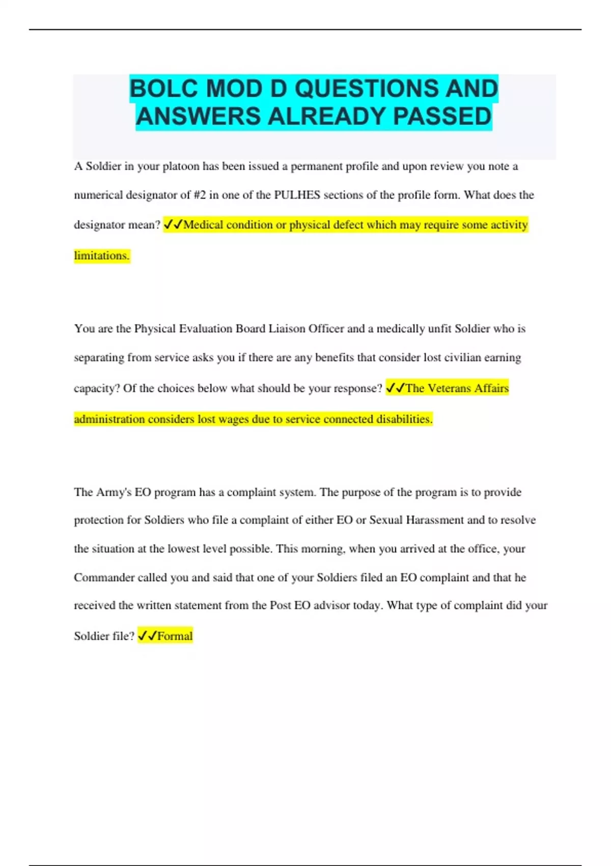 BOLC MOD D QUESTIONS AND ANSWERS ALREADY PASSED A Soldier in your platoon has been issued a permanent profile and upon review you note a numerical designator of #2 in one of the PULHES sections of the profile form. What does the designator mean? Medical condition or physical defect which may require some activity limitations. You are the Physical Evaluation Board Liaison Officer and a medically unfit Soldier who is separating from service asks you if there are any benefits that consider lost civilian earning capacity? Of the choices below what should be your response? The Veterans Affairs administration considers lost wages due to service connected disabilities. The Army's EO program has a complaint system. The purpose of the program is to provide protection for Soldiers who file a complaint of either EO or Sexual Harassment and to resolve the situation at the lowest level possible. This morning, when you arrived at the office, your Commander called you and said that one of your Soldiers filed an EO complaint and that he received the written statement from the Post EO advisor today. What type of complaint did your Soldier file? Formal Early identification of Soldiers is a critical part of the Army's suicide prevention model. You and the Commander have been in training and something called "Gatekeepers" was a topic of the discussion. The training is now over and the Commander has asked you to refresh his memory about Medical Health Care providers. The Commander wants to know if they are considered Formal Gatekeepers. What is your answer to the Commander? Yes, Medical Heath Care professionals are Formal Gatekeepers. You warned one of your female Soldiers repeatedly about her choice of words when conversing with her male counterparts. Today, you spoke with the Soldier again concerning your warnings about her word choices. You verbally counseled her and said that she is still violating the Army's EO policy by using the terms "Honey, Babe, and Sweetheart" when conversing with her male counterparts. Are those terms really a violation of the Army's EO policy? Yes, all of these terms are considered "terms of endearment" and would be a form of verbal sexual harassment After your arrival to your new unit, the first thing you noticed was a lack of common respect towards fellow Soldiers. Once assigned to your section, you overheard several comments about others in a sexual way and the junior NCOs appeared to be included in your observation. What positive EO/Sexual Harassment actions can you take as the newly assigned Leader of the section? Include counseling, training and education, and integration of EO into your welcome counseling Your unit just had a class on Suicide Prevention. One of the main things you remember from the training was the "Primary Phase." This phase incorporated all personnel to include "buddies" cooperating in a command directed community-wide effort to eliminate feelings of helplessness and hopelessness for Soldiers before they begin. What is the word that corresponds with the Primary Phase? The Screen Phase. As a Platoon Leader, you are considering various referral sources for Soldiers with suicide symptoms. Is the Chaplain a referral source that you can use? Yes, the Chaplain is the primary unhindered referral source. Soldiers can go directly to the Chaplain. Soldiers will behave as directed as long as they see you behaving the same way. You are briefing your Soldiers this afternoon on typical EO/Sexual Harassment actions. Which of the following is not an EO action you want to include in your brief to the Soldiers? Submission tactics for the aggressor The members of the board are documenting the extent of the injury or illness and deciding if the Soldier's medical condition is severe enough to question their ability to continue serving in a full duty capacity. Of the choices below, which board is the scenario referring to? Medical Evaluation Board (MEB) Your Commander wants to reduce the number of remaining training requirements for this fiscal year so he asked you to teach a class on Suicide Prevention. Your research for the training event uncovered the following statement: "Recognizing the obvious signs and symptoms of distress/crisis and potential emotional/mental disorder while providing caring support and needed Interventions." What phase of the Army's suicidal model does the statement refer too? Secondary Phase. You have recently been assigned to a new Army agency. The purpose of the organization is to review cases of the PEB to ensure the findings and recommendations were just, equitable, consistent with the facts, and in keeping with the provisions of laws and regulations. Which of the choices below is the correct name of the agency? U.S. Army Physical Disability Agency (USAPDA) Your Company Commander asked you to identify the "All or Nothing" trigger mechanism discussed in your recent training on the characterization of suicidal behavior. What is the correct answer? The Soldier sees things in black and white categories. If the relationship fails, the Soldier sees himself as a failure and as the sole reason for the break-up. The prevention of Sexual Harassment is the Commander's responsibility. Your Commander tasked you to provide oversight of and assistance to the unit's Equal Opportunity Advisor (EOA), SFC Jones. SFC Jones asked you if you know what the three categories of Sexual Harassment are. What is the correct answer? Verbal, nonverbal, and physical contact Your unit had a class on Suicide Prevention today. One of the main things you remember from the training was the "Tertiary Phase." You also recalled that Behavioral Health Professionals perform at this level. What is the word that corresponds with the "Tertiary" Phase? The Secure Phase. The Commander sent PFC Jones to the MP station because he believed the Soldier was intoxicated while on duty. The Soldier was tested and had a Blood Alcohol Level (BAL) of .03% grams of alcohol per 100 milliliters of blood. 