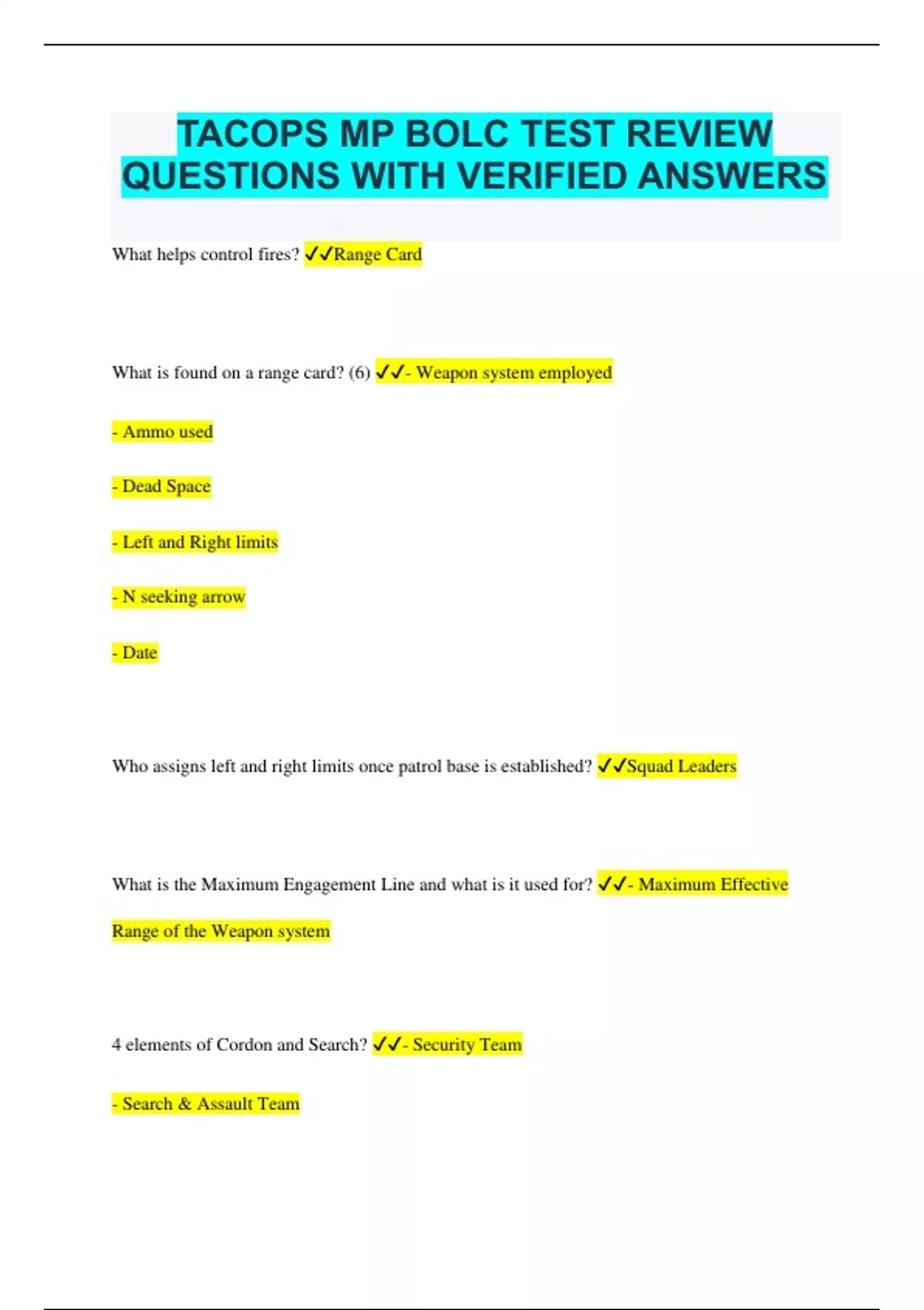 TACOPS MP BOLC TEST REVIEW QUESTIONS WITH VERIFIED ANSWERS What helps control fires? Range Card What is found on a range card? (6) - Weapon system employed - Ammo used - Dead Space - Left and Right limits - N seeking arrow - Date Who assigns left and right limits once patrol base is established? Squad Leaders What is the Maximum Engagement Line and what is it used for? - Maximum Effective Range of the Weapon system 4 elements of Cordon and Search? - Security Team - Search & Assault Team - Support & Reserve Team - Command Element What are the Doctrinal phases of Cordon and Search? (6) - Planning - Recon - Movement to Objective - Isolation - Search - Withdrawal Which Cordon is focused on in Ingress and which is focused on Egress? Outer: Focuses on Ingress into OBJ area, threats to inner cordon and assault element Inner: Prevents Egress from OBJ area and threats to search element prior to getting a foothold What is the purpose of a route recon? - Gain detailed info on route What are the methods of recon? What is not? - Box - Fan - Successive Sector - Converging Routes * CLOVER is not one What is the goal of area recon? - So no unexpected enemy gets in the rear What are the teams in recon? (2) - R (Recon) & S (Security) What do you submit to higher after a recon? (DA FORM) - Overlay - Route Recon Report (DA FORM 1248) Forms of Offensive Maneuver? (5) Penetration: Attacking force seeks to rupture ENY defenses on narrow front to disrupt defense Frontal: Attacking force destroys weaker enemy using broad front Infiltration: Covert movement of attacking force through ENY lines Envelopment: Avoids ENY defenses by seizing OBJ to their rear to destroy them in their position Turning Movement: Avoid ENY principle defenses to seize OBJ causing ENY to leave position Difference between envelopment and turning movement? - Envelopment attempts to destroy ENY in current position and Turning Movement attempts to make ENY leave position. Types of Offensive Operations? (4) - Movement to Contact - Attacks - Exploitation - Pursuit Characteristics of Offensive Operations? (4) - Surprise - Tempo - Audacity - Concentration Types of Movement (Dismounted)? - Traveling: ENY contact not likely - Traveling Overwatch: ENY contact possible - Bounding Overwatch: ENY