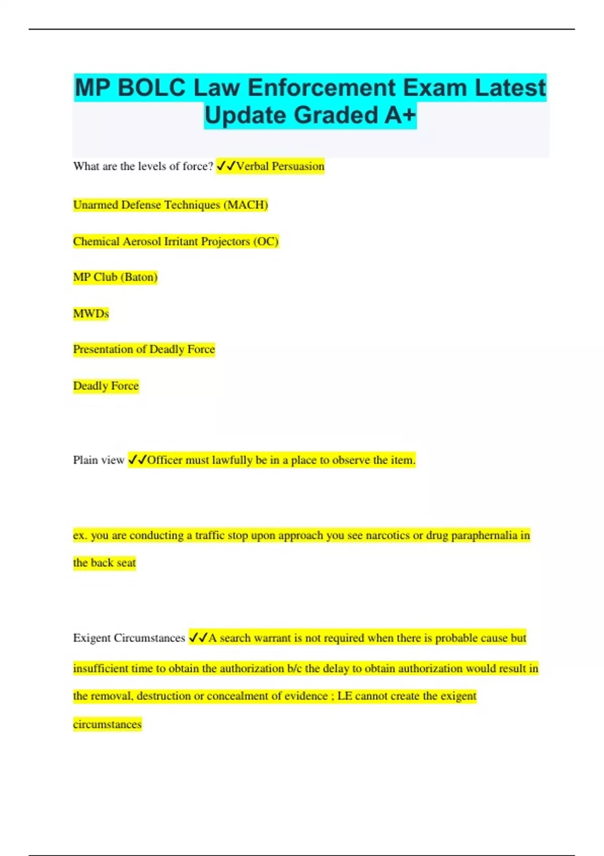MP BOLC Law Enforcement Exam Latest Update Graded A+ What are the levels of force? Verbal Persuasion Unarmed Defense Techniques (MACH) Chemical Aerosol Irritant Projectors (OC) MP Club (Baton) MWDs Presentation of Deadly Force Deadly Force Plain view Officer must lawfully be in a place to observe the item. ex. you are conducting a traffic stop upon approach you see narcotics or drug paraphernalia in the back seat Exigent Circumstances A search warrant is not required when there is probable cause but insufficient time to obtain the authorization b/c the delay to obtain authorization would result in the removal, destruction or concealment of evidence ; LE cannot create the exigent circumstances Consent Searches - given voluntarily (preferably in writing) - given by a person who has control over the property - given with a limited scope - withdrawn at any time during the search - when consent is freely given ; coercion cannot be used to obtain consent Report Writing Clear and concise ; chronological Law Enforcement Reports (LER) the primary product of LE and constitute the only permanent record of activities that can have far reaching impact ; all LERs are generated in ALERTS and automatically formatted in a memo style NCIC Searches what Searches everything Does personal identifiable info (PII) need to be protected? Yes it is one of our priorities What should you do with someone who has a disability? Mental - take additional time to clarify info, don't become frustrated, use the individuals family members when applicable physical - adhere to standard LE practices but use common sense if transportation is required, assist individuals if needed When you are overseas what should you take into account? cultural differences and become familiar with local SOPs What should you use for abnormal behavior? Stay calm and asses the situation - use IPC skills to deescalate the situation ; call for backup if unsafe What are the different types of patrols? 1. Static (fixed) - surveillance of a specific area 2. Dismounted (foot) - access to limited visibility ares 3. Mounted (vehicle) - high-test degree of mobility 4. Bicycle - greater mobility than foot travel 5. MWD - use for narcotics, explosive detection or tracking persons 6. Boat and watercraft - repose capabilities for