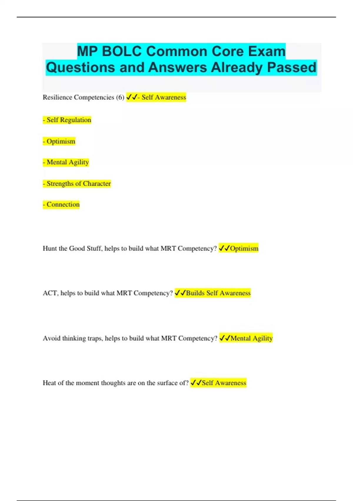 MP BOLC Common Core Exam Questions and Answers Already Passed Resilience Competencies (6) - Self Awareness - Self Regulation - Optimism - Mental Agility - Strengths of Character - Connection Hunt the Good Stuff, helps to build what MRT Competency? Optimism ACT, helps to build what MRT Competency? Builds Self Awareness Avoid thinking traps, helps to build what MRT Competency? Mental Agility Heat of the moment thoughts are on the surface of? Self Awareness Iceberg beliefs are someones? Deeper rules on how the world should operate; the world is dangerous; you should respect your elders; I am strong; People can't be trusted Energy Management, helps to build what MRT Competency? Self Regulation Problem Solving, helps to build what MRT Competency? Mental Agility Problem Solving Steps Step 1: What's the problem you're trying to solve? Step 2: What caused the problem? Step 3: What did you miss? Step 4: What's the evidence that each factor contributed to the problem? Step 5: What really caused the problem? Step 6: What can you do about it? Put it in Perspective (PIIP), helps to build what MRT Competency? Optimism and lowers anxiety Put It In Perspective (PIIP) Steps - Step 1: Describe activating steps - Step 2: Capture worst case thoughts - Step 3: Generate best case thoughts - Step 4: Identify most likely outcomes - Step 5: Develop a plan for dealing w/most likely outcomes When would you use (PIIP)? When you're making a mountain out of a molehill or making a Himalaya out of a mountain Real-time Resilience, helps to build what MRT Competency? Optimism You would use Real Time Resilience to prepare for? An anticipating Activating Event Use Real Time Resilience when your...? Thoughts are distracting you from an immediate task or goal IDEAL Model I - ID and Understand the problem D - Describe the problem objectively and accurately E - Express your concerns and how you feel