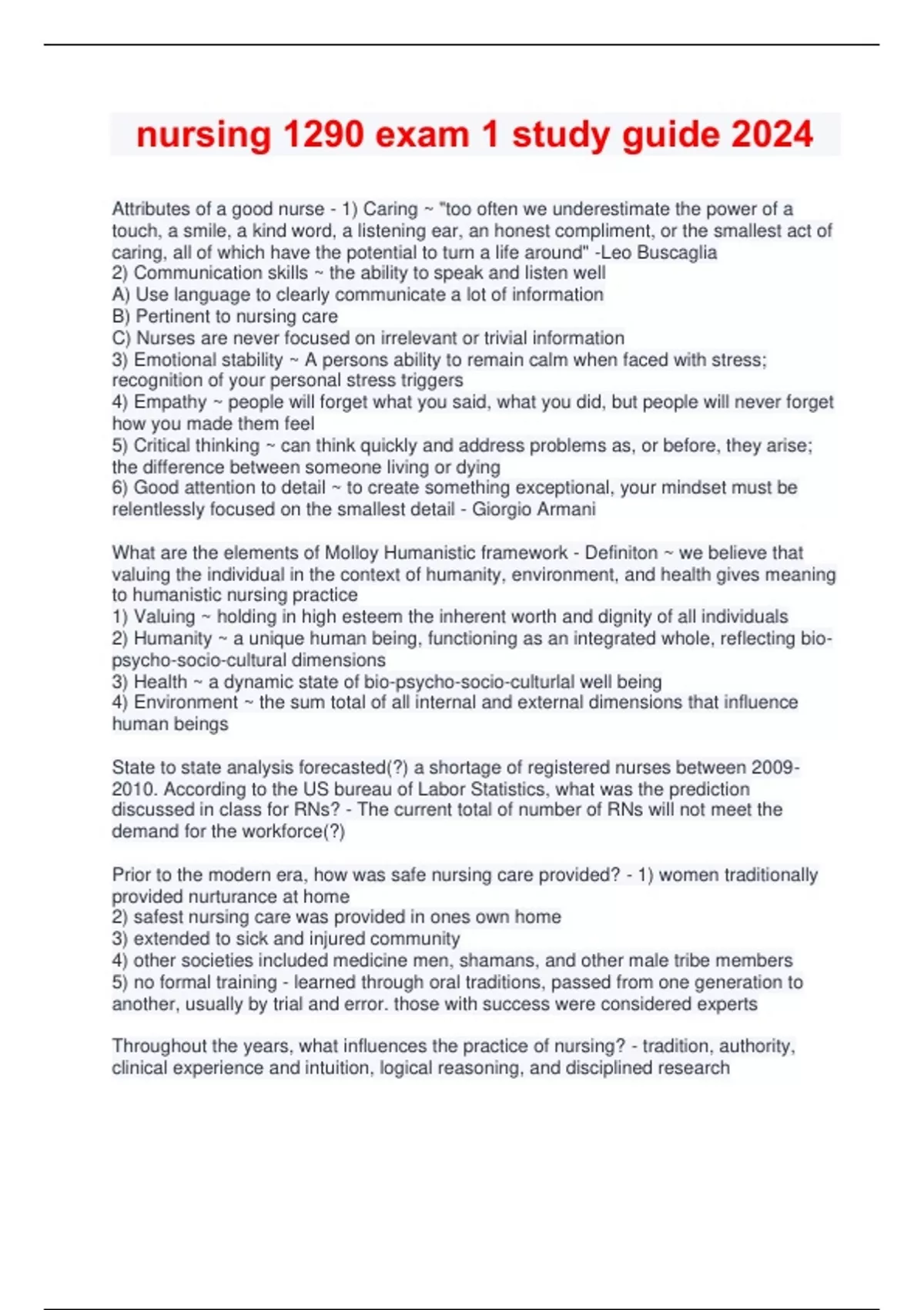 Attributes of a good nurse - 1) Caring ~ "too often we underestimate the power of a touch, a smile, a kind word, a listening ear, an honest compliment, or the smallest act of caring, all of which have the potential to turn a life around" -Leo Buscaglia 2) Communication skills ~ the ability to speak and listen well A) Use language to clearly communicate a lot of information B) Pertinent to nursing care C) Nurses are never focused on irrelevant or trivial information 3) Emotional stability ~ A persons ability to remain calm when faced with stress; recognition of your personal stress triggers 4) Empathy ~ people will forget what you said, what you did, but people will never forget how you made them feel 5) Critical thinking ~ can think quickly and address problems as, or before, they arise; the difference between someone living or dying 6) Good attention to detail ~ to create something exceptional, your mindset must be relentlessly focused on the smallest detail - Giorgio Armani What are the elements of Molloy Humanistic framework - Definiton ~ we believe that valuing the individual in the context of humanity, environment, and health gives meaning to humanistic nursing practice 1) Valuing ~ holding in high esteem the inherent worth and dignity of all individuals 2) Humanity ~ a unique human being, functioning as an integrated whole, reflecting bio-psycho-socio-cultural dimensions 3) Health ~ a dynamic state of bio-psycho-socio-culturlal well being 4) Environment ~ the sum total of all internal and external dimensions that influence human beings State to state analysis forecasted(?) a shortage of registered nurses between . According to the US bureau of Labor Statistics, what was the prediction discussed in class for RNs? - The current total of number of RNs will not meet the demand for the workforce(?) Prior to the modern era, how was safe nursing care provided? - 1) women traditionally provided nurturance at home 2) safest nursing care was provided in ones own home 3) extended to sick and injured community 4) other societies included medicine men, shamans, and other male tribe members 5) no formal training - learned through oral traditions, passed from one generation to another, usually by trial and error. those with success were considered experts Throughout the years, what influences the practice of nursing? - tradition, authority, clinical experience and intuition, logical reasoning, and disciplined research Role of Deconess - The first visiting nurses Kaiserwerth Deaconess Institute - - Hospital and medical school with a 3 year course of study for Protestant deaconesses, including training in nursing, pharmacy, and teaching; - considered the most significant early - Protestant nursing organization. - opened by pastor theodur fliedur Who was the most famous student of Kaiserwerth - Florence Nightingale Mary Breckinridge - Frontier Nursing Service (FNS) A) established in 1925 B) healthcare to women and their families in rural Kentucky C) educated as nurse midwife in england D) started first school of midwifery in the US in 1939 E) between ~ 17053 berths and 11 maternal deaths = well below national average F) beginning of pre-natal care G) inducted into ANA' hall of fame contributions of women, community, and family nursing and rural health care delivery Isabel Robb - 1) competencies needed to be proven in order to receive qualifications 2) first president of ANA 3) organized nursing school superintendents which became the National League of Nurses 4) member of the committee to form the AJN Dorothea Dix - 1) appointed to organize military hospitals, provide trained nurses (nurse recruiter), and disperse supplies 2) received official status and no salary for this position 3) fought for rights of the mentally ill 4) 6 million people hospitalized during the war- one half million surgical cases; 2000 nurses served in the war 5) most effective advice of the 19th century Florence Nightingale - 1) founder of modern nursing 2) established the fort nursing philosophy based on health maintenance and restoration 3) first practicing nurse epidemiologist 4) first nurse researcher 5) changed society's views of nurses 6) traveled to Crimea for the war 7) "notes of nursing" ~ pure air, pure water, efficient drainage, cleanliness, and light 8) body and mood as separate entities and basis of holistic view of health; data and. outcomes; nursing research and evidence based practice 9) the nurse who could improve the health of her patients by increasing airflow and encouraging hand washing