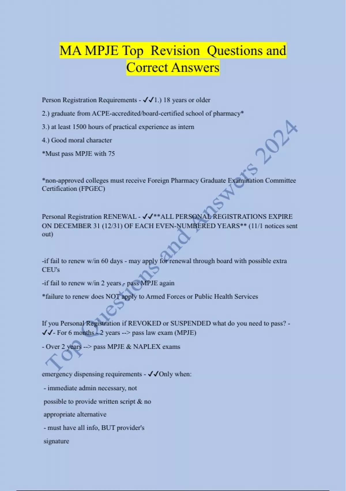 Person Registration Requirements - 1.) 18 years or older 2.) graduate from ACPE-accredited/board-certified school of pharmacy* 3.) at least 1500 hours of practical experience as intern 4.) Good moral character *Must pass MPJE with 75 *non-approved colleges must receive Foreign Pharmacy Graduate Examination Committee Certification (FPGEC) Personal Registration RENEWAL - **ALL PERSONAL REGISTRATIONS EXPIRE ON DECEMBER 31 (12/31) OF EACH EVEN-NUMBERED YEARS** (11/1 notices sent out) -if fail to renew w/in 60 days - may apply for renewal through board with possible extra CEU's -if fail to renew w/in 2 years - pass MPJE again *failure to renew does NOT apply to Armed Forces or Public Health Services If you Personal Registration if REVOKED or SUSPENDED what do you need to pass? - - For 6 months - 2 years --> pass law exam (MPJE) - Over 2 years --> pass MPJE & NAPLEX exams emergency dispensing requirements - Only when: - immediate admin necessary, not possible to provide written script & no appropriate alternative - must have all info, BUT provider's signature - CAN dispense CII orally or electronically, BUT... - Written Rx must be provided within 7 DAYS - "Authorization for Emergency Dispensing" on face - IF FAIL TO PROVIDE: pharmacist notifies DEA; US Dept of Justice & Commissioner of Pub Health PMP (Prescription Monitoring Program) Requirements - - every RPh that dispenses CIICV shall transmit to DOP required info for reach Rx What must be maintained on pharmacy premises? - 1.) MA List of Interchange Drugs (MLID), orange book, additional&exception list 2.) Current compendia & board regs (CMR 247) 3.) Balance that can weigh 13 mg (test&seal annually) 4.) Appropriate sanitary appliances (i.e. sink w/ hot&cold H2O in or near where Rx are to be filled) 5.) at least 1 bound book for recording sales of non-Rx controlled substances 6.) at least 1 bound book for recording sales of alocholic beverages How many square feet of prescription area should there be? - 300 square feet w/ a patient consultation area accessible from outside this prescription area Requirements for central IV admixture service clean room - 1.) must be min. of 72 square ft 2.) all sides closed except for door 3.) Laminar flow hood with HEPA filters & continuous positive pressure - board-approved hood certification annually Conspicuously displayed within the pharmacy - 1.) Pharmacy permit (expires 12/31 of ODD YEARS) 2.) Pharmacy's MA controlled substance registration (expires 12/31 of ODD YEARS) 3.) Pharmacy's DEA controlled substance registration 4.) Pharmacy's certificate of fitness *any certificate of registration from board shall be conspicuously displayed in place of business Pharmacy Storage/Safety Requirements - - CII-CV must be stored within prescription area - either securely locked cabinet OR dispersed in prescription drug storage area throughout the stocks of CVI - ** EXCEPT CIIs, WHICH MUST ALWAYS BE LOCKED UP - Separate alarm & floor to ceiling barrier for pharmacy department - All drug deliveries are brought directly to the pharmacy - PHARMACIST CANNOT REMAIN ON DUTY FOR MORE THAN 12 HOURS Readily available/Obviously displayed in pharmacy - - PHARMACY MUST DISPLAY AT THE MAIN ENTRANCE OF PHARMACY THE NAME OF THE MANAGER OF RECORD AND THE HOURS OF OPERATIONS - Each full time RPh shall have readily available OR displayed their certificate of registration and the original or copy of wallet reg Changes at the Pharmacy - - CHANGE IN MOR - sworn statement that complete inventory done; signed by incoming and leaving MOR - report within 10 working days - CHANGE LOCATION/SPACE OF PHARMACY - must submit copies for board approval