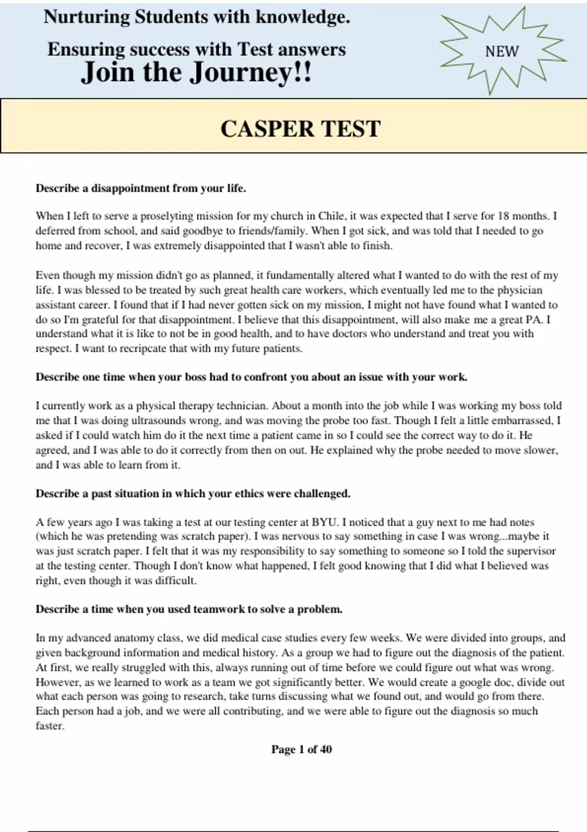 CASPER TEST. Describe a disappointment from your life. When I left to serve a proselyting mission for my church in Chile, it was expected that I serve for 18 months. I deferred from school, and said goodbye to friends/family. When I got sick, and was told that I needed to go home and recover, I was extremely disappointed that I wasn't able to finish. Even though my mission didn't go as planned, it fundamentally altered what I wanted to do with the rest of my life. I was blessed to be treated by such great health care workers, which eventually led me to the physician assistant career. I found that if I had never gotten sick on my mission, I might not have found what I wanted to do so I'm grateful for that disappointment. I believe that this disappointment, will also make me a great PA. I understand what it is like to not be in good health, and to have doctors who understand and treat you with respect. I want to recripcate that with my future patients. Describe one time when your boss had to confront you about an issue with your work. I currently work as a physical therapy technician. About a month into the job while I was working my boss told me that I was doing ultrasounds wrong, and was moving the probe too fast. Though I felt a little embarrassed, I asked if I could watch him do it the next time a patient came in so I could see the correct way to do it. He agreed, and I was able to do it correctly from then on out. He explained why the probe needed to move slower, and I was able to learn from it. Describe a past situation in which your ethics were challenged. A few years ago I was taking a test at our testing center at BYU. I noticed that a guy next to me had notes (which he was pretending was scratch paper). I was nervous to say something in case I was wrong...maybe it was just scratch paper. I felt that it was my responsibility to say something to someone so I told the supervisor at the testing center. Though I don't know what happened, I felt good knowing that I did what I believed was right, even though it was difficult. Describe a time when you used teamwork to solve a problem. In my advanced anatomy class, we did medical case studies every few weeks. We were divided into groups, and given background information and medical history. As a group we had to figure out the diagnosis of the patient. At first, we really struggled with this, always running out of time before we could figure out what was wrong. However, as we learned to work as a team we got significantly better. We would create a google doc, divide out what each person was going to research, take turns discussing what we found out, and would go from there. Each person had a job, and we were all contributing, and we were able to figure out the diagnosis so much faster.