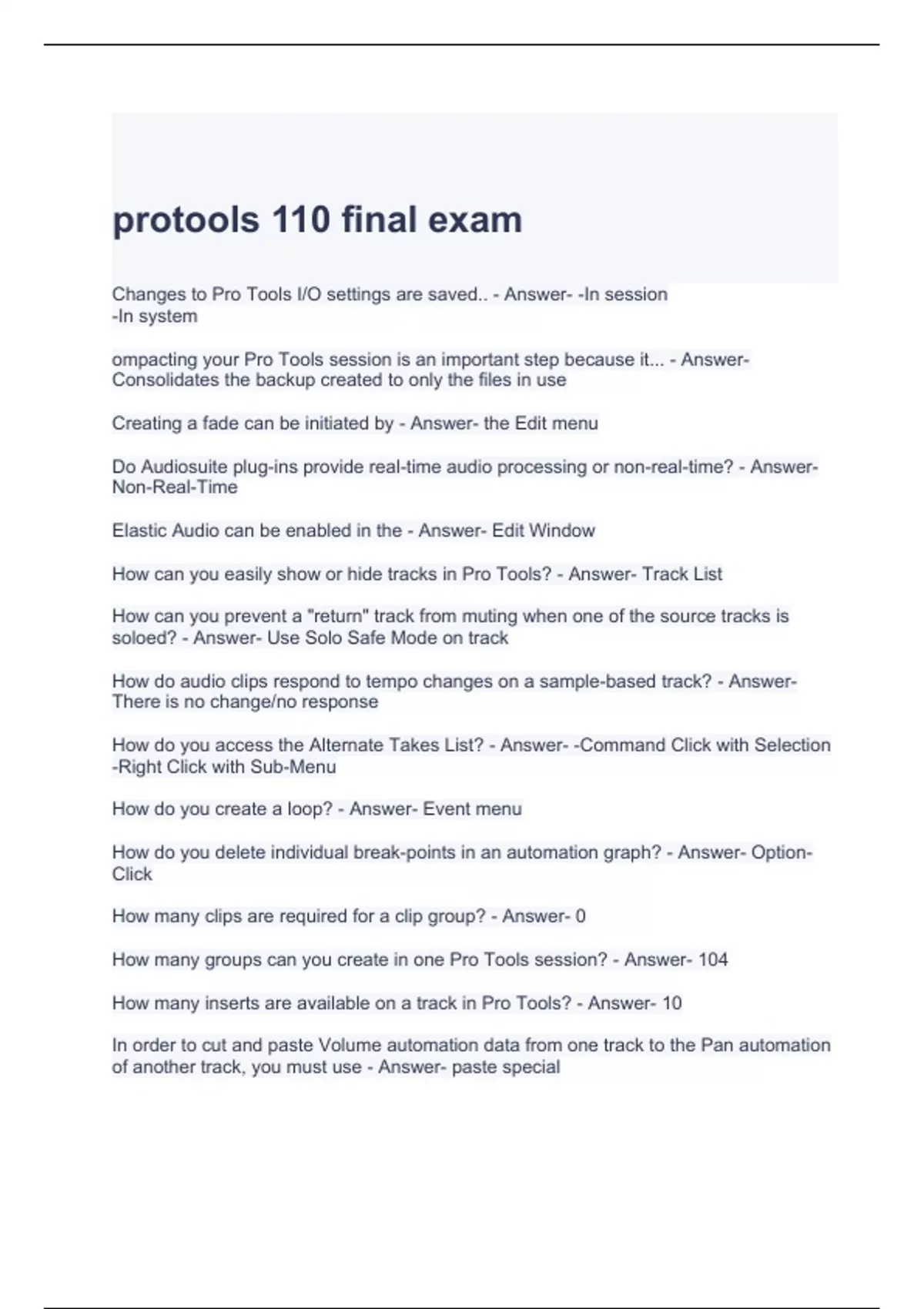 protools 110 final exam with correct answers