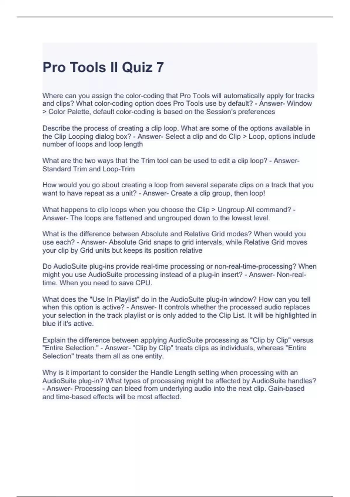 Exam of 2 pages for the course Pro Tools 110 at Pro Tools 110 (Pro Tools II Quiz 7)